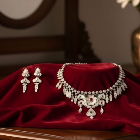 Traditional Silver-Plated Necklace Set with Red & Green Enamel Accents