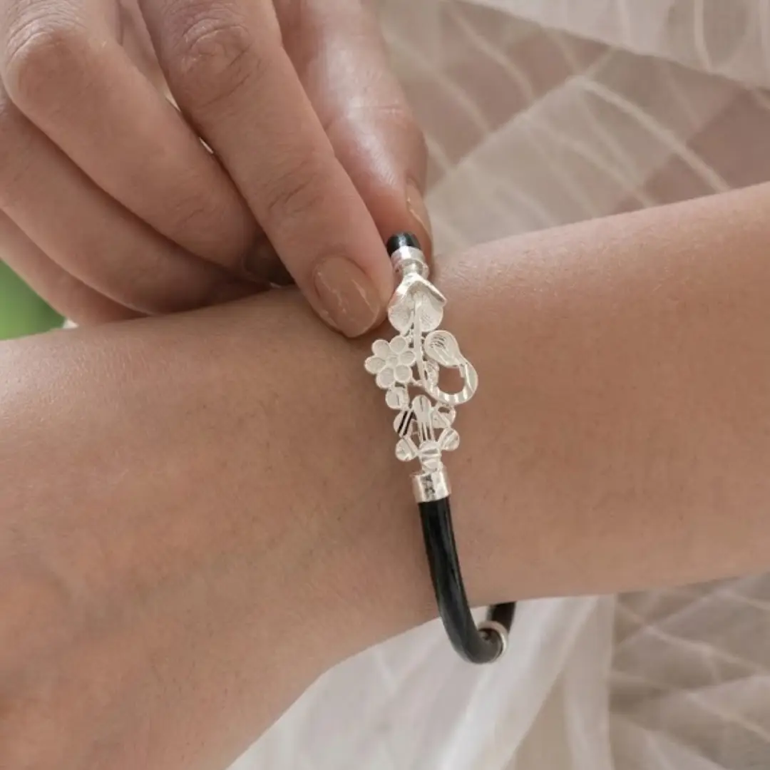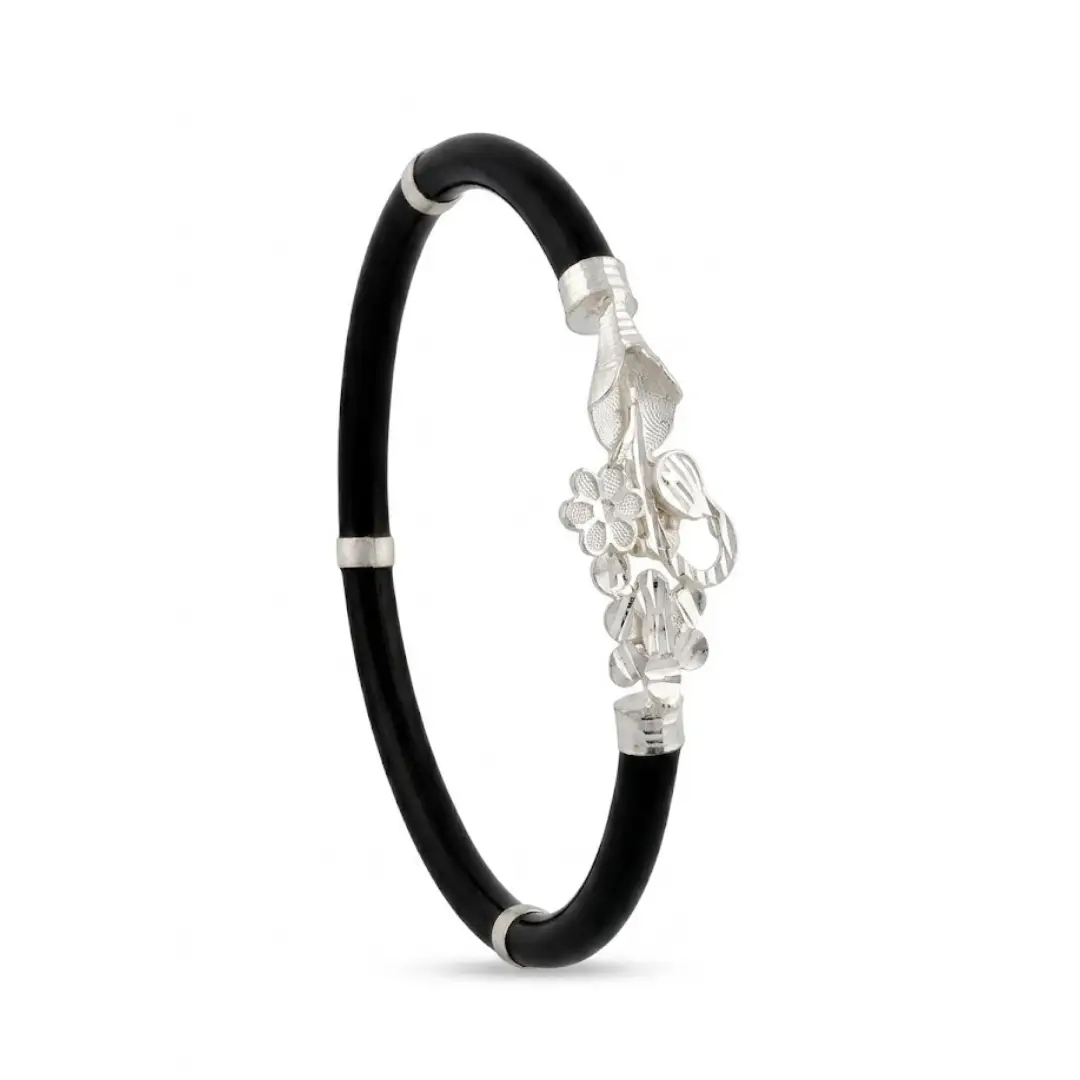 Add a touch of timeless beauty to your jewelry collection with our IS 925 Silver Noya Bangle. This unique piece features a deep black base that perfectly highlights the shimmering 925 sterling silver floral motifs. Crafted with precision, the centerpiece displays delicate silver flowers and textured leaf patterns, making it a standout accessory for any occasion.