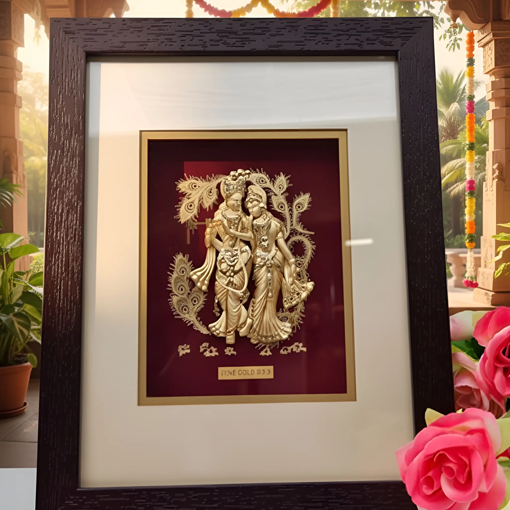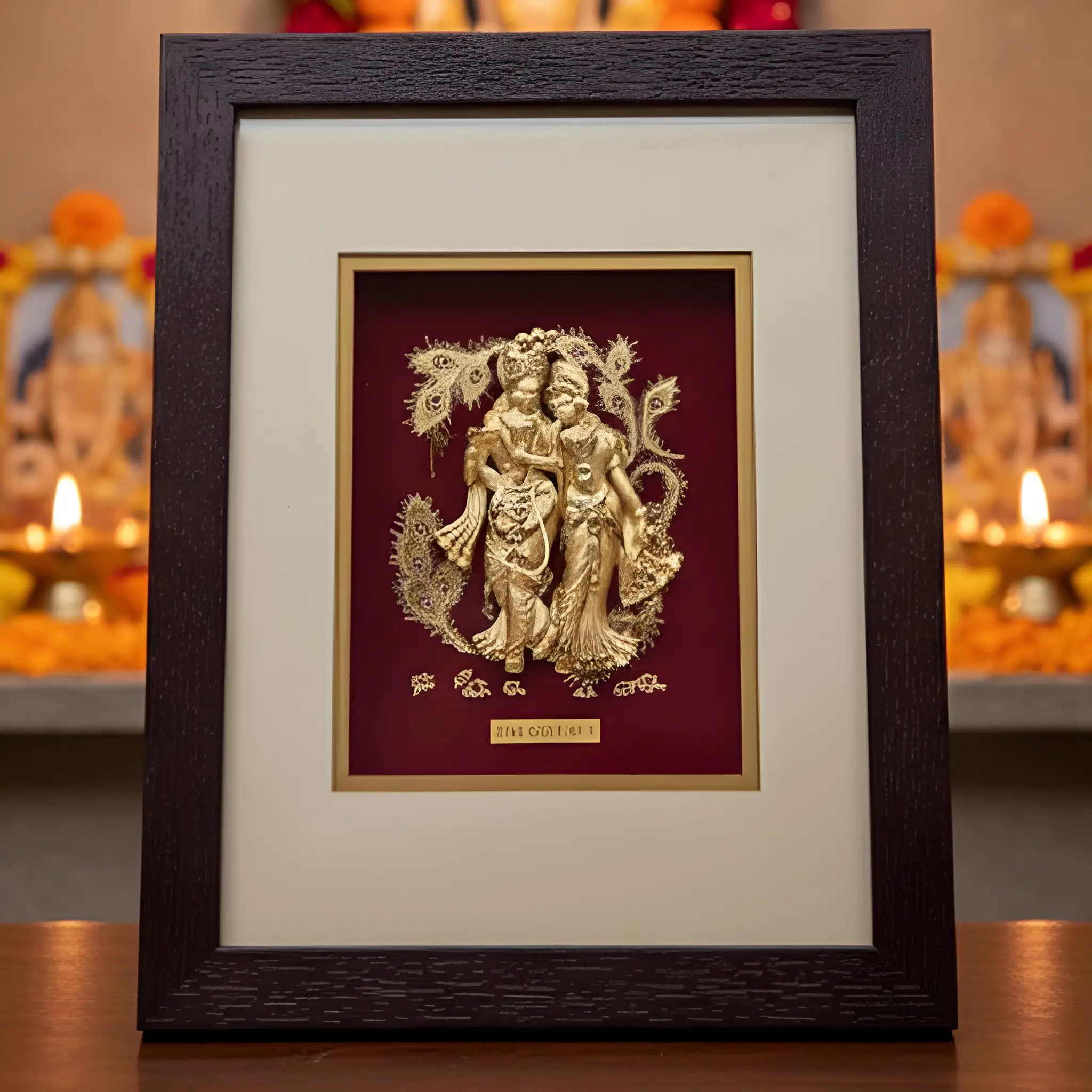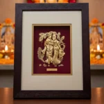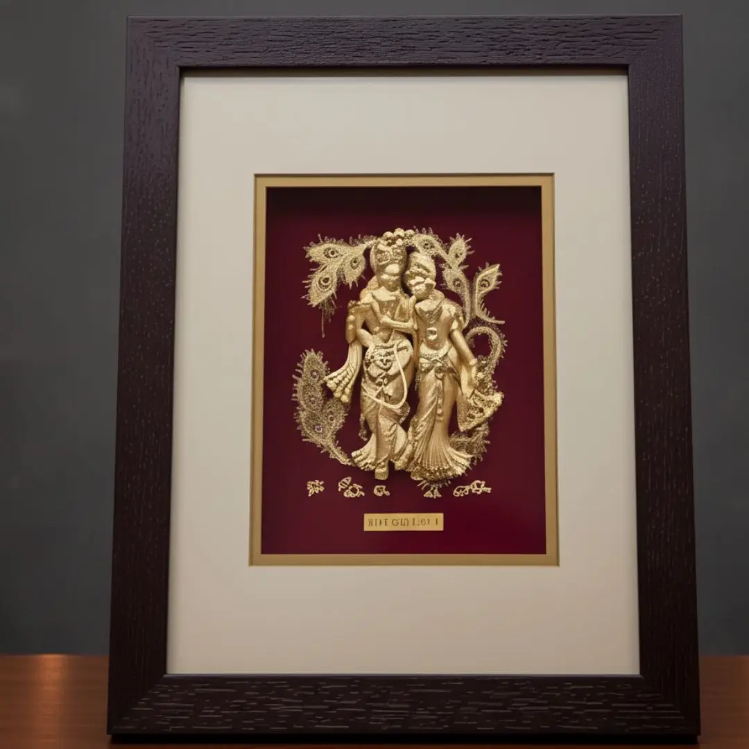 Bring the divine aura of selfless love into your home with this Premium 24k Gold Leaf Radha Krishna Photo Frame. This exquisite piece of art features the beloved deities Radha and Krishna in a graceful pose, meticulously crafted with 99.9% fine gold leaf. The shimmering golden silhouettes are set against a deep crimson background, accented by intricate peacock feather motifs that symbolize purity and beauty.