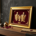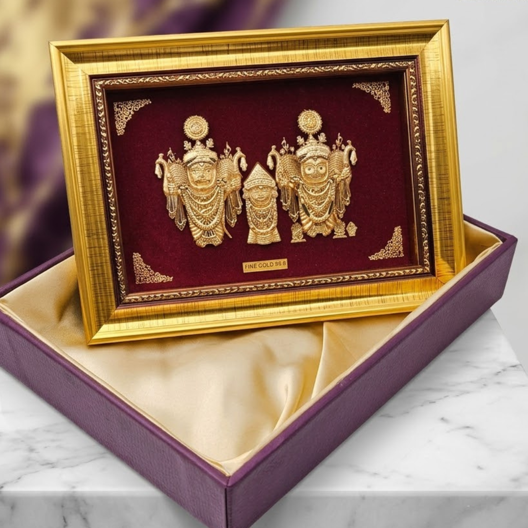 This exquisite 24K Gold Plated Jagannath Photo Frame captures the sacred trio—Lord Jagannath, Balabhadra, and Subhadra—with exceptional detail and devotion. This frame is designed not only to grace your home temple but also to serve as a prestigious gift for auspicious occasions.