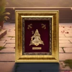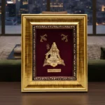 The golden silhouette is beautifully showcased against a rich, deep maroon velvet background, highlighted by classic motifs and encased in a premium textured golden frame. It is an ideal addition to any home temple, yoga studio, or office desk.