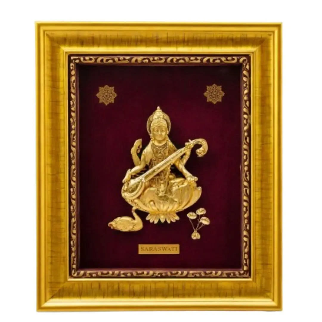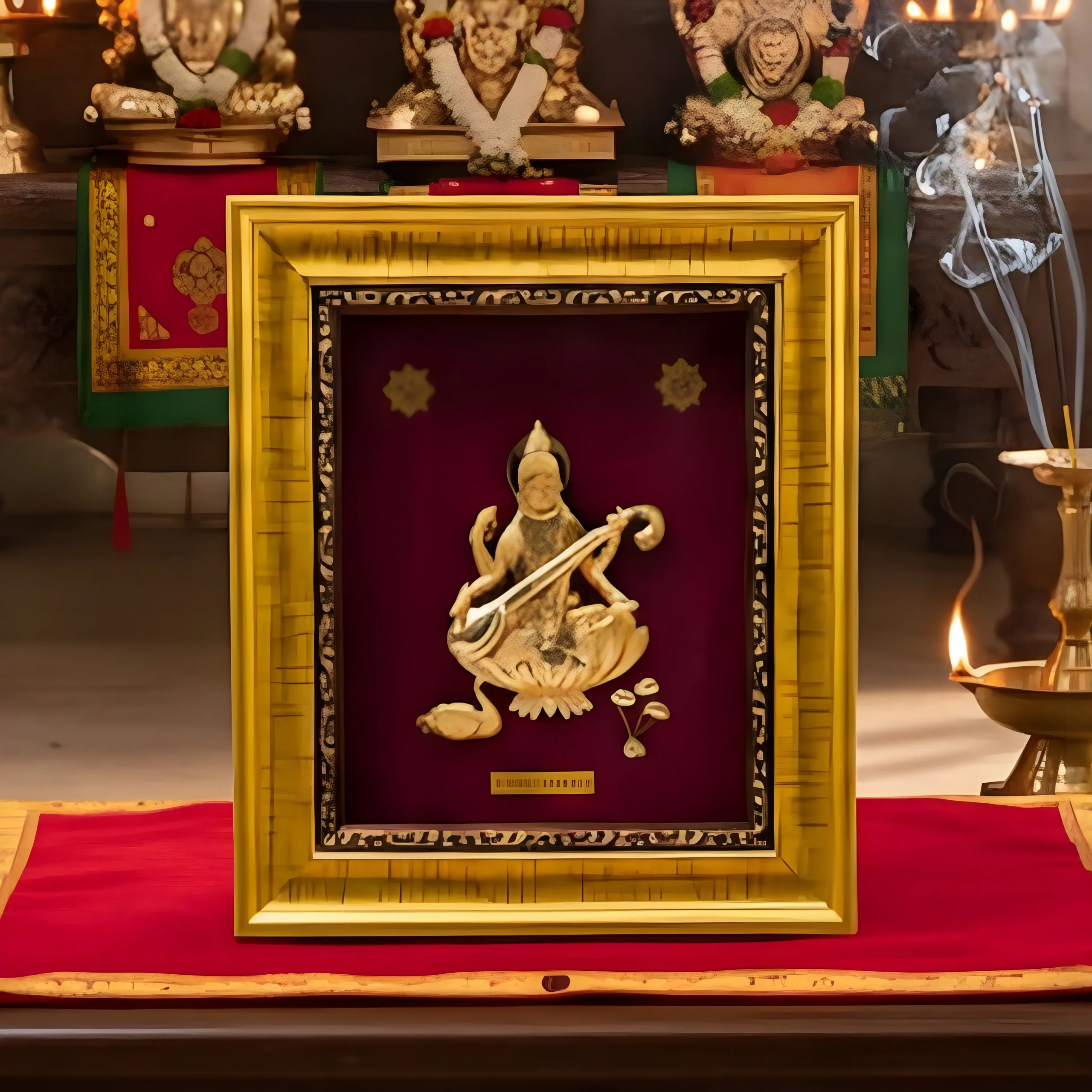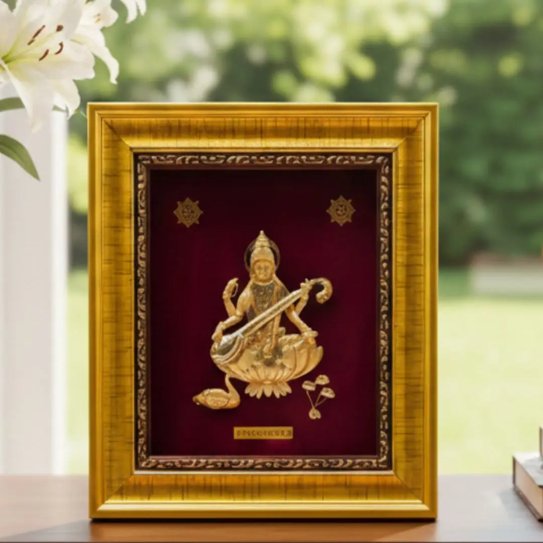 Embrace wisdom and artistic grace with our premium 24k Gold Plated Saraswati Photo Frame. This masterpiece features an intricately crafted idol of Goddess Saraswati, the deity of knowledge, music, and arts. Set against a rich velvet backdrop and encased in a premium textured gold-finish frame, it serves as a perfect spiritual anchor for your home, office, or study table.