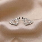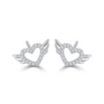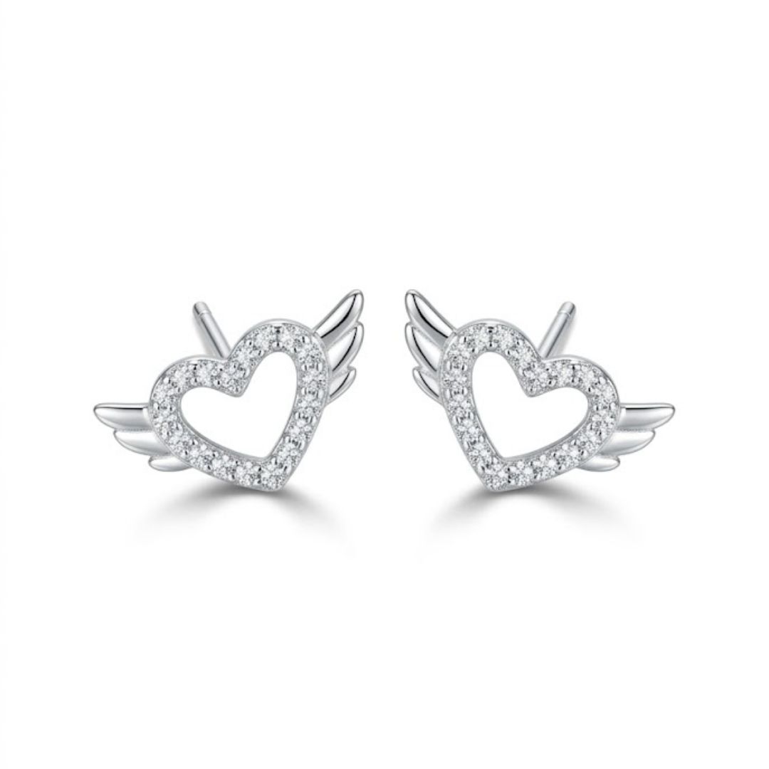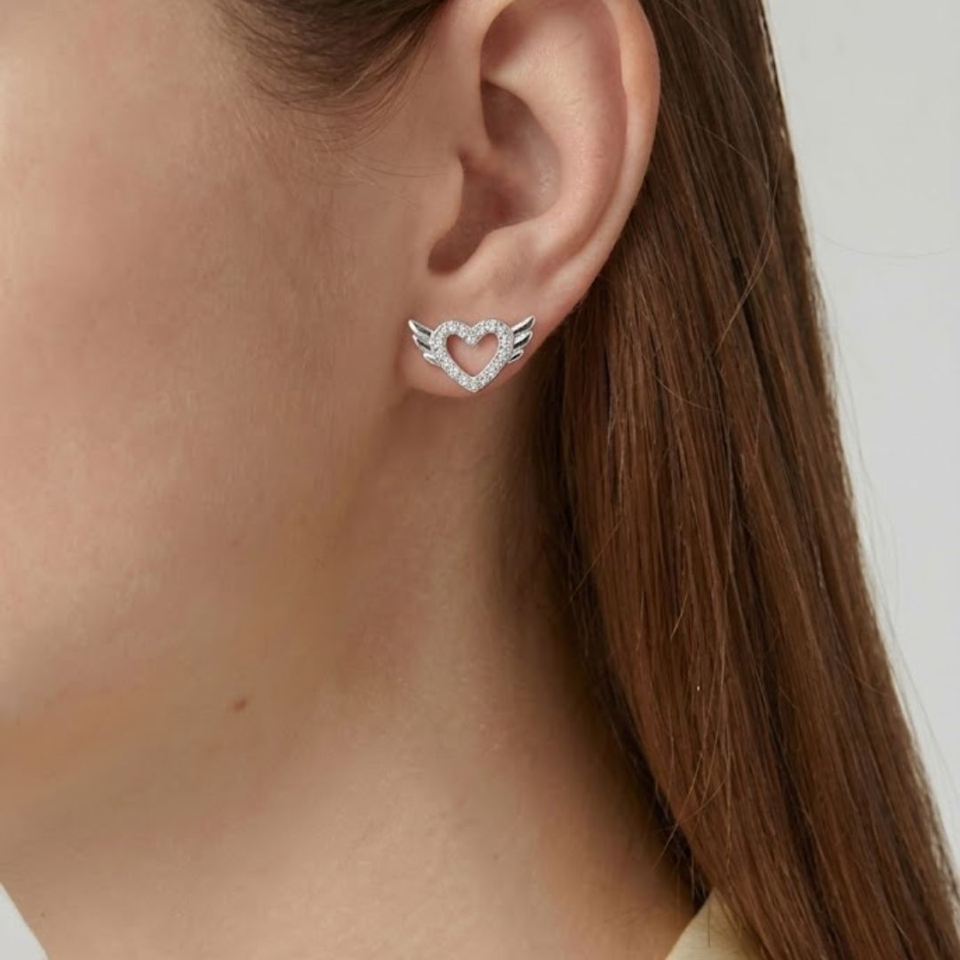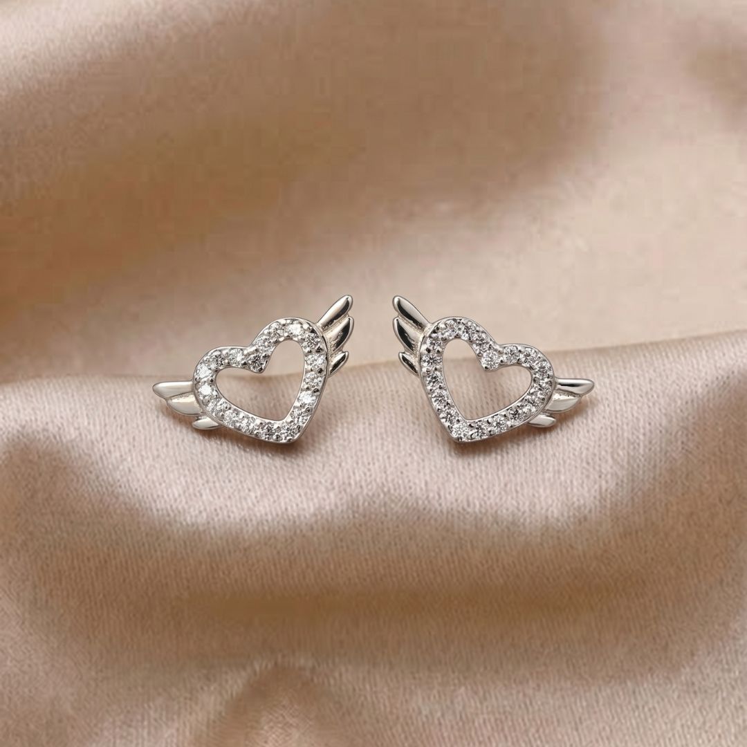 Embrace a heavenly glow with our Angel Wing Heart Stud Earrings, elegantly crafted from Fine 925 Silver. These unique earrings feature a delicate hollow heart silhouette embellished with shimmering micro-pave zirconia stones, flanked by beautifully detailed silver wings.