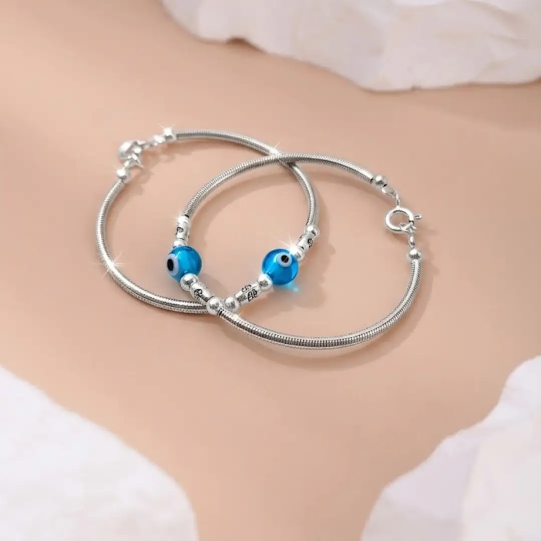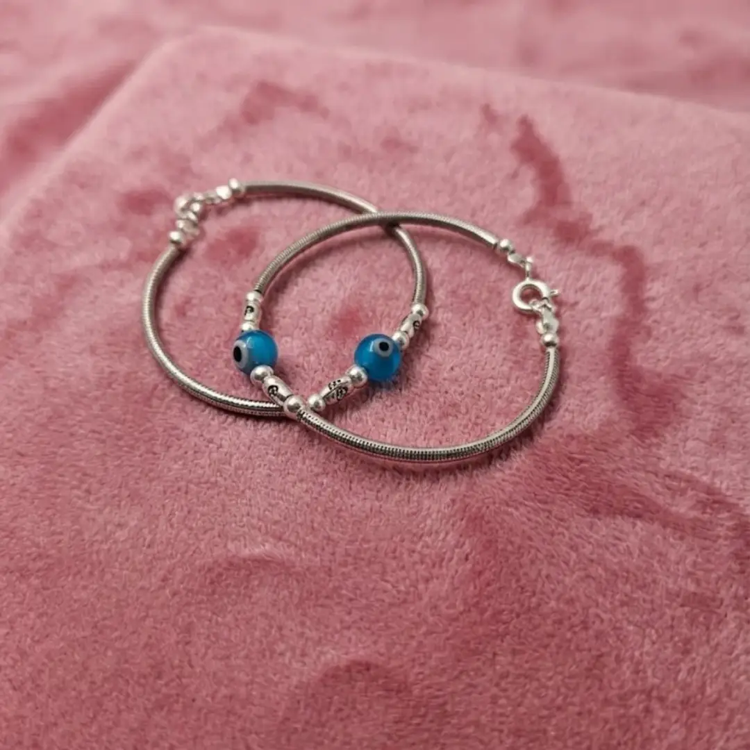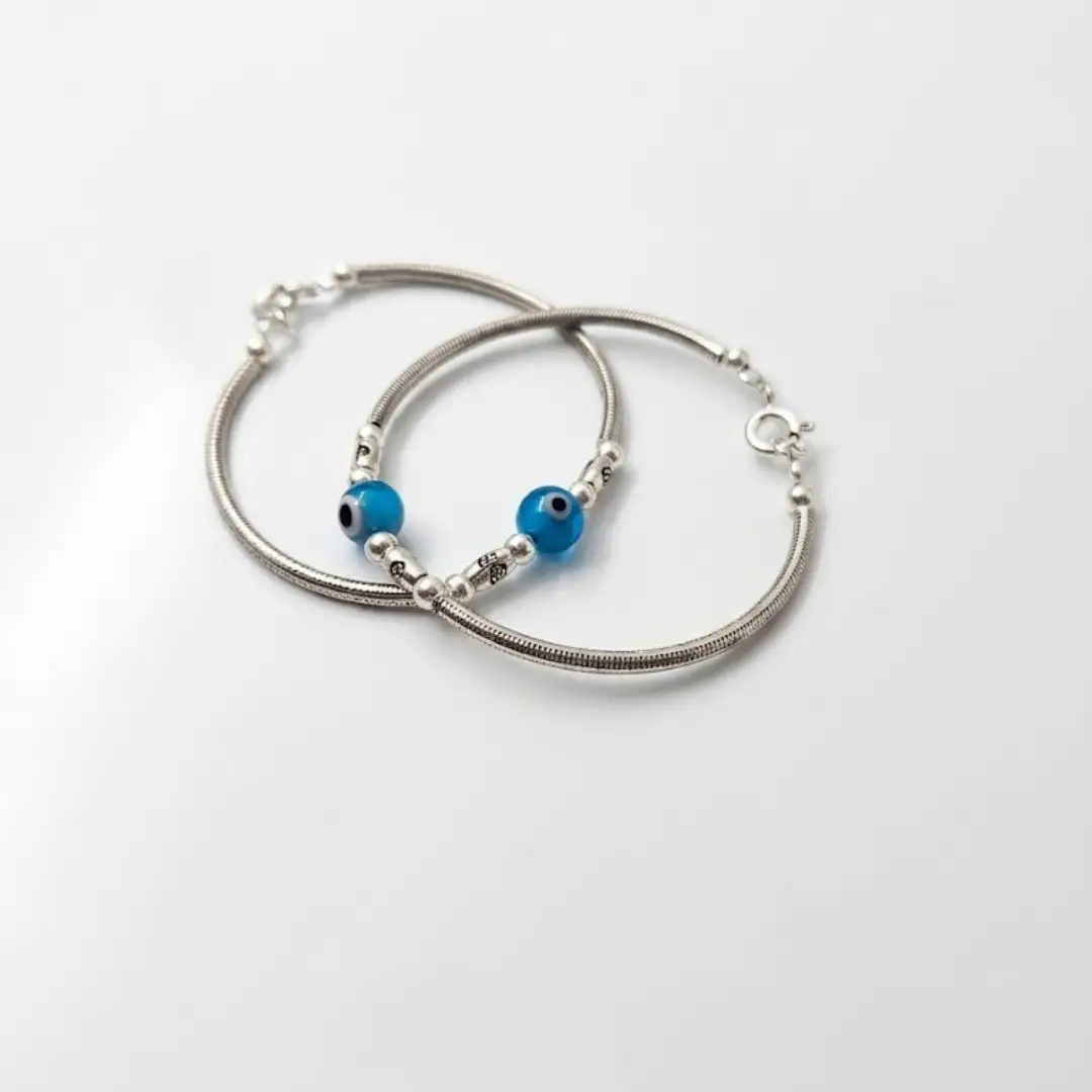 Ensure your little one stays protected and stylish with our handcrafted 925 Silver Baby Blue Evil Eye Nazariya Kada. This elegant pair features the traditional deep blue Evil Eye beads, believed to ward off negative energy and bring good fortune. Expertly crafted from Fine 925 Silver, these kadas boast a smooth, flexible snake-chain texture that feels gentle against a baby’s delicate skin.