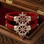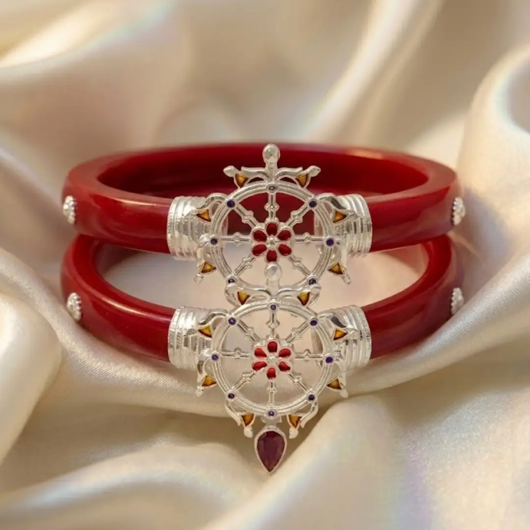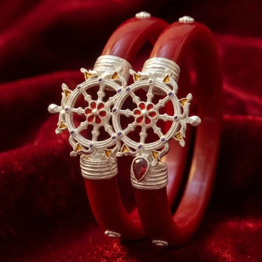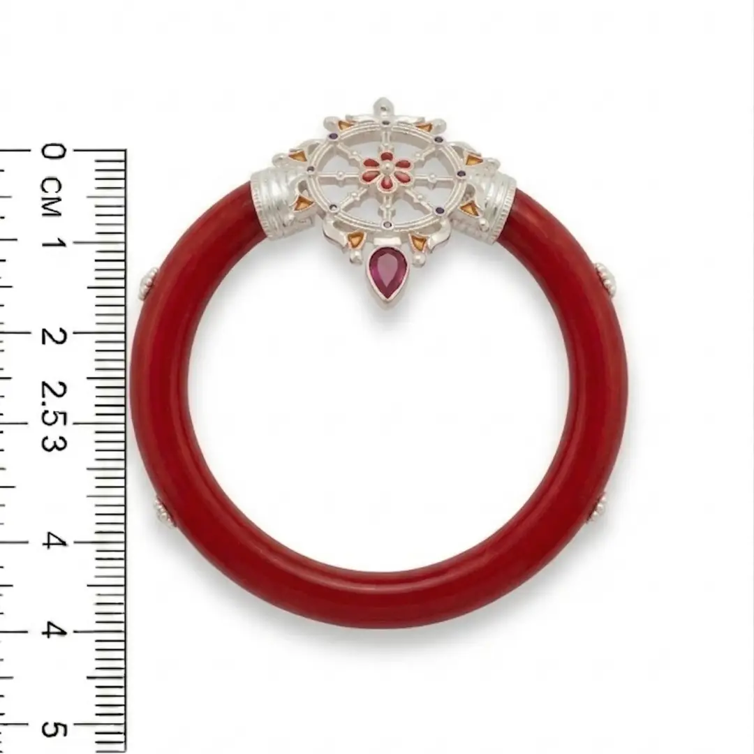 Infuse your style with spiritual significance and modern elegance. Our 925 Silver Dharma Chakra Pola Bangle features a rich red Pola base paired with an intricately handcrafted sterling silver Dharma Chakra (Wheel of Law). The centerpiece is adorned with a stunning red gemstone and delicate enamel accents, blending ancient symbolism with premium jewelry design for the contemporary woman.