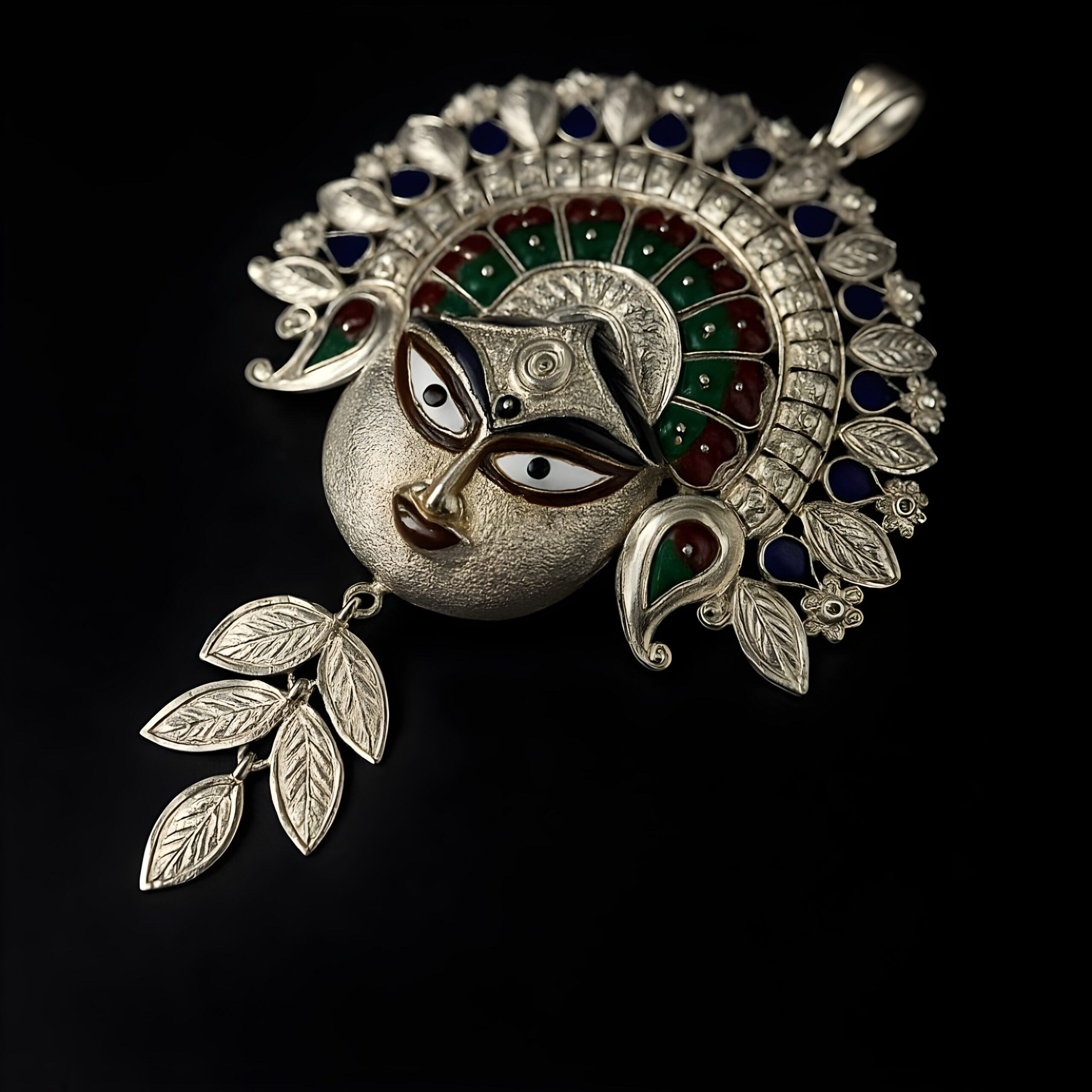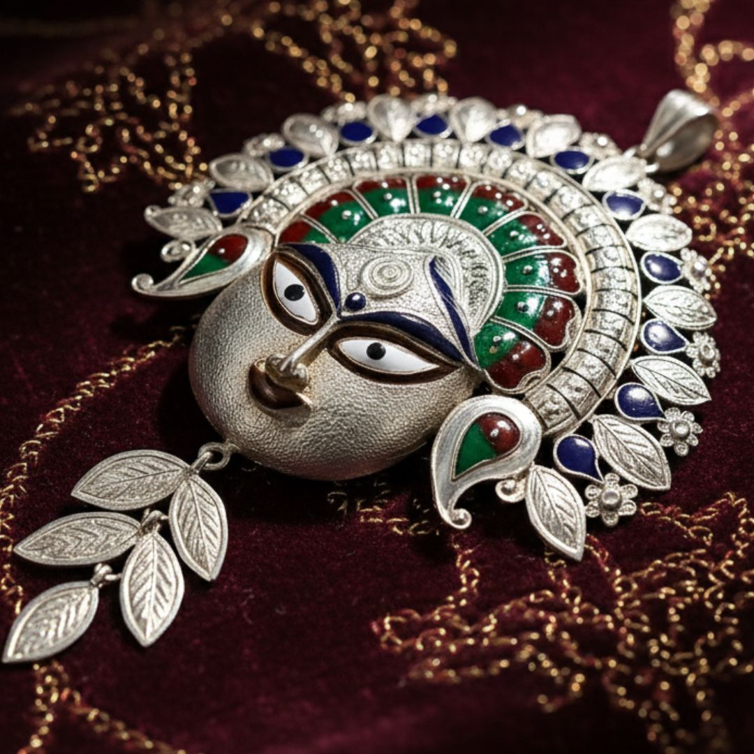 Celebrate divine grace and artistry with this 925 Sterling Silver Durga Ma Pendant, intricately handcrafted with colorful enamel work. The pendant beautifully captures the serene and powerful face of Goddess Durga, symbolizing protection, strength, and prosperity. Made from pure sterling silver, it features fine detailing and a polished finish that enhances its spiritual elegance. Ideal for festive wear, religious ceremonies, or as a meaningful gift, this pendant radiates devotion and timeless craftsmanship.