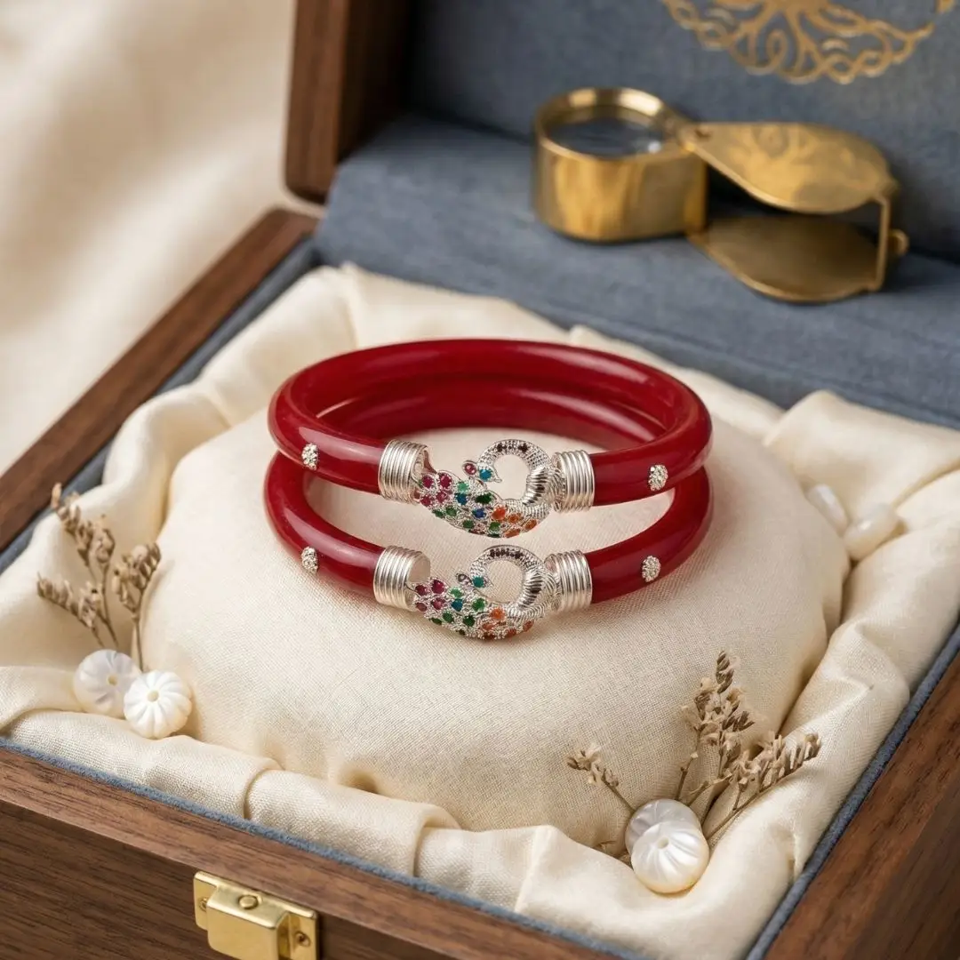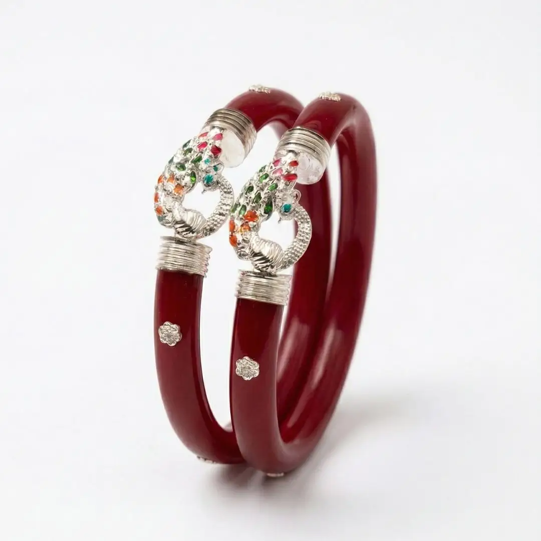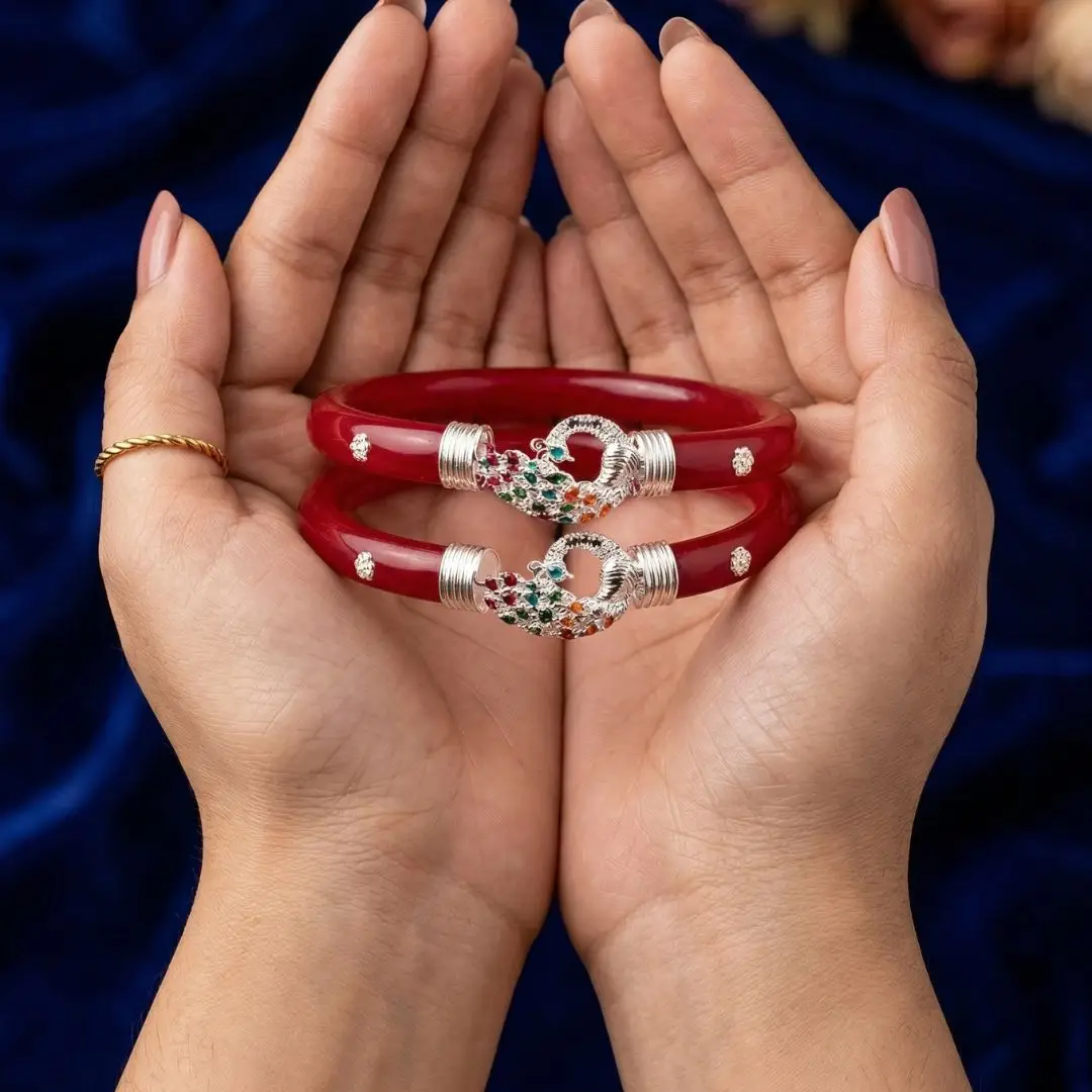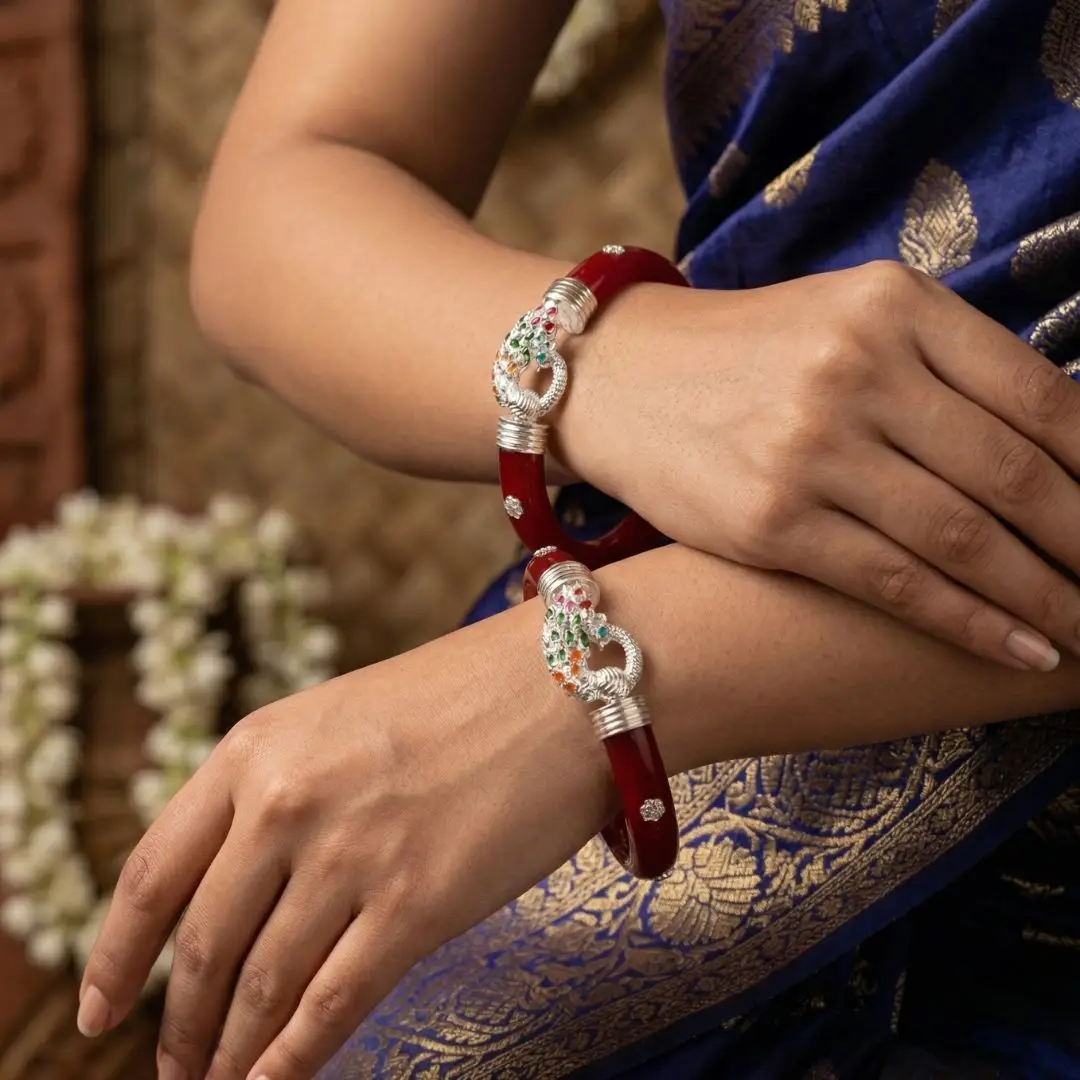 Elevate your traditional attire with a touch of royal elegance. This 925 Silver Pola Bangle by The Velvet Box is a perfect blend of Bengali heritage and sophisticated jewelry design. Handcrafted with precision, the vibrant red pola is beautifully accented with high-quality silver work featuring a majestic peacock motif adorned with colorful stone detailing.
