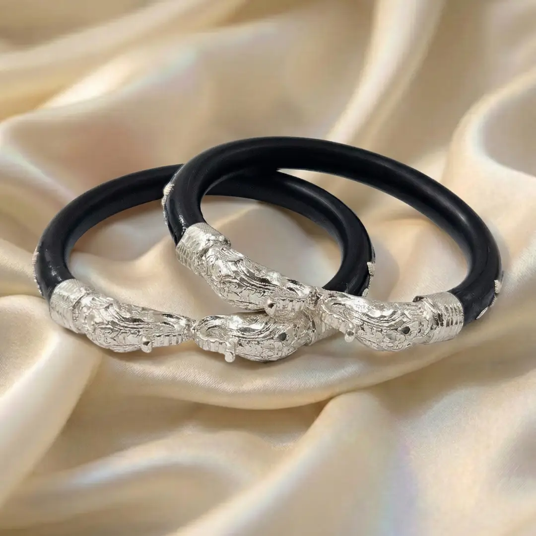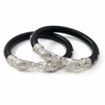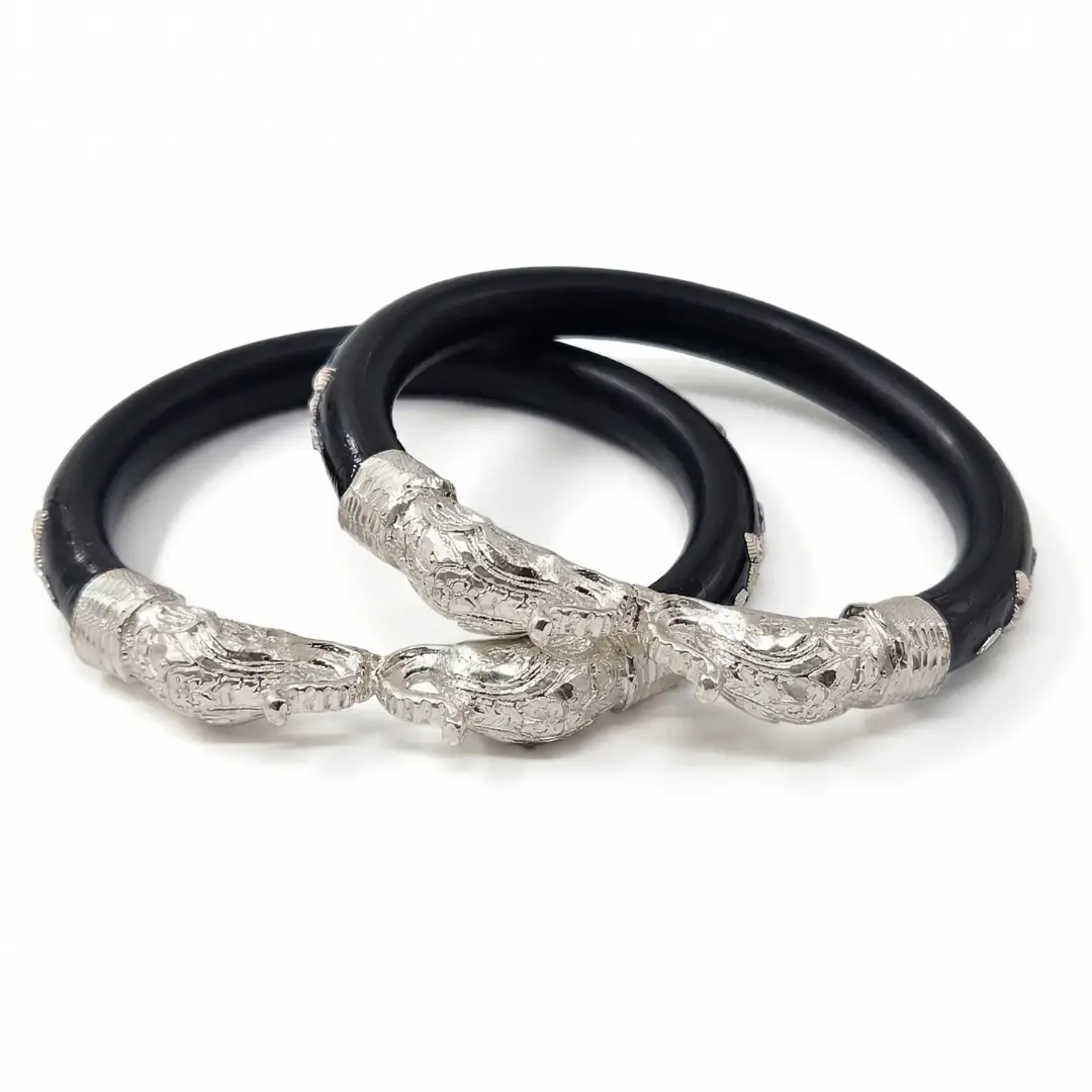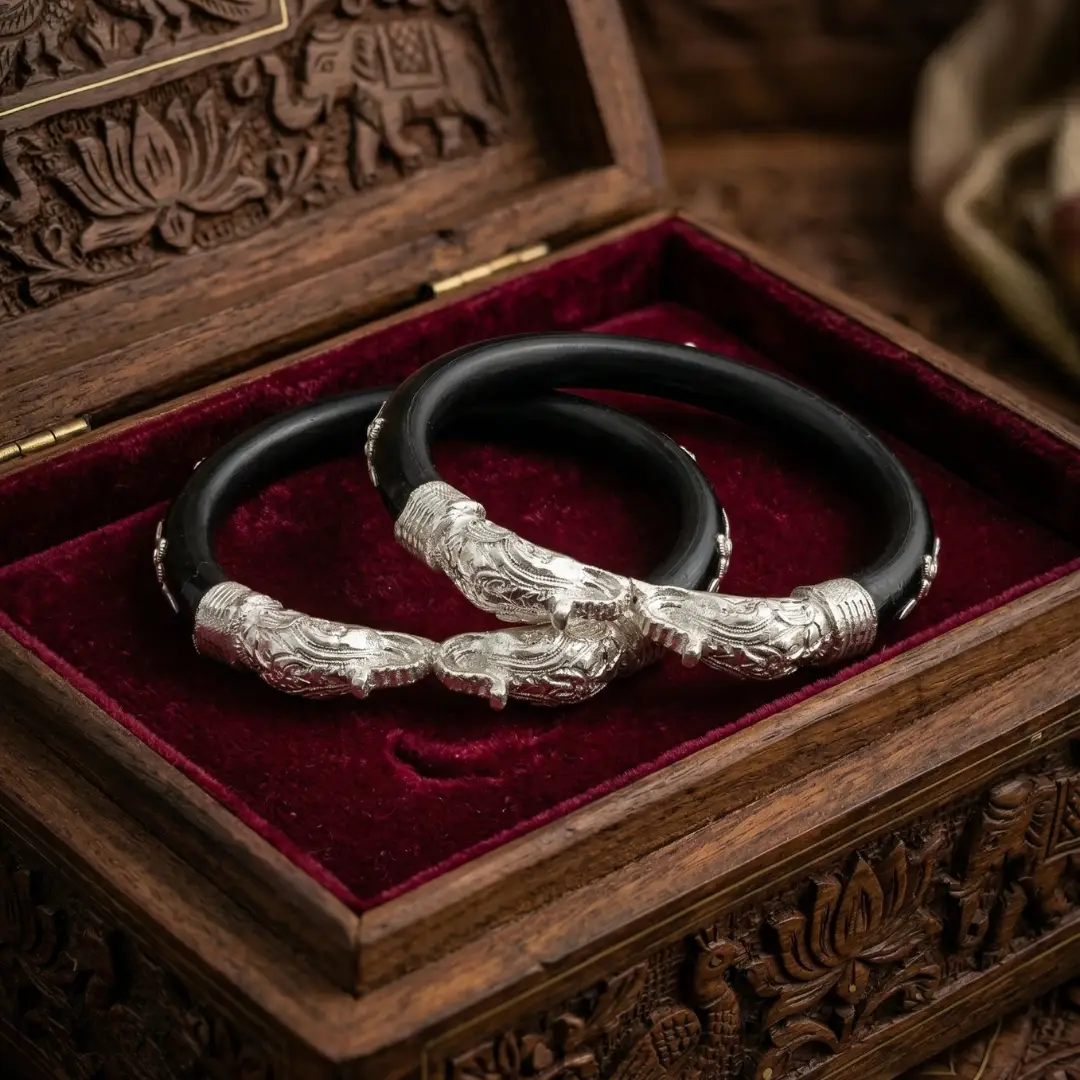 Experience the perfect blend of strength and tradition with our 925 Silver Elephant Face Pola Bangle. This exquisite piece features a sleek, high-quality black base contrasted beautifully with detailed sterling silver elephant motifs at the ends. Symbolizing wisdom and power, this elephant design brings a unique cultural significance to your jewelry collection.