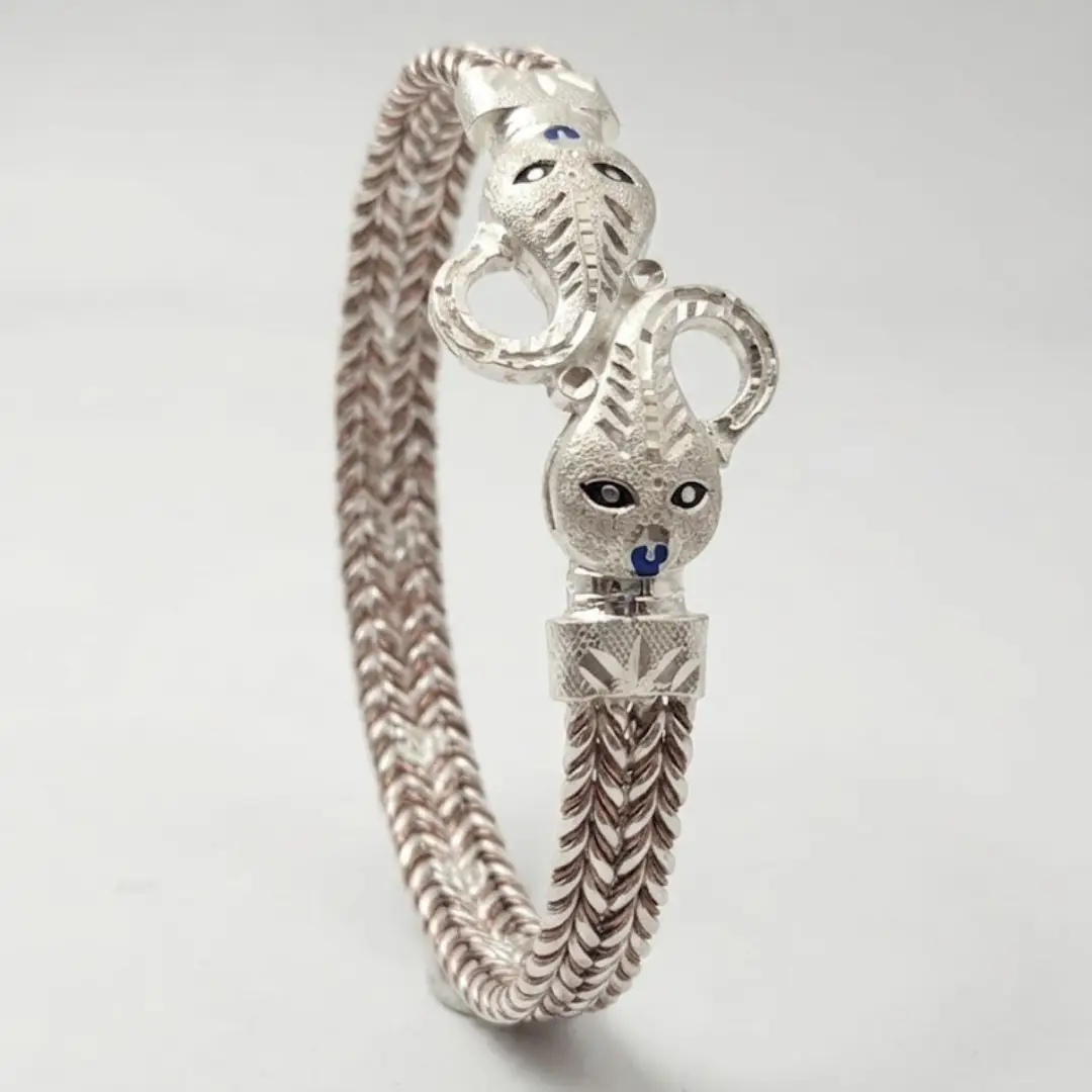Embrace strength and elegance with the 925 Silver Elephant Noya Bangle from The Velvet Box. This unique piece features a masterfully crafted twin-elephant motif, adorned with striking blue stone eyes that add a touch of royal charm. The center design is seamlessly integrated into a premium braided silver band, offering a robust yet refined look.