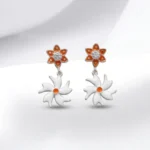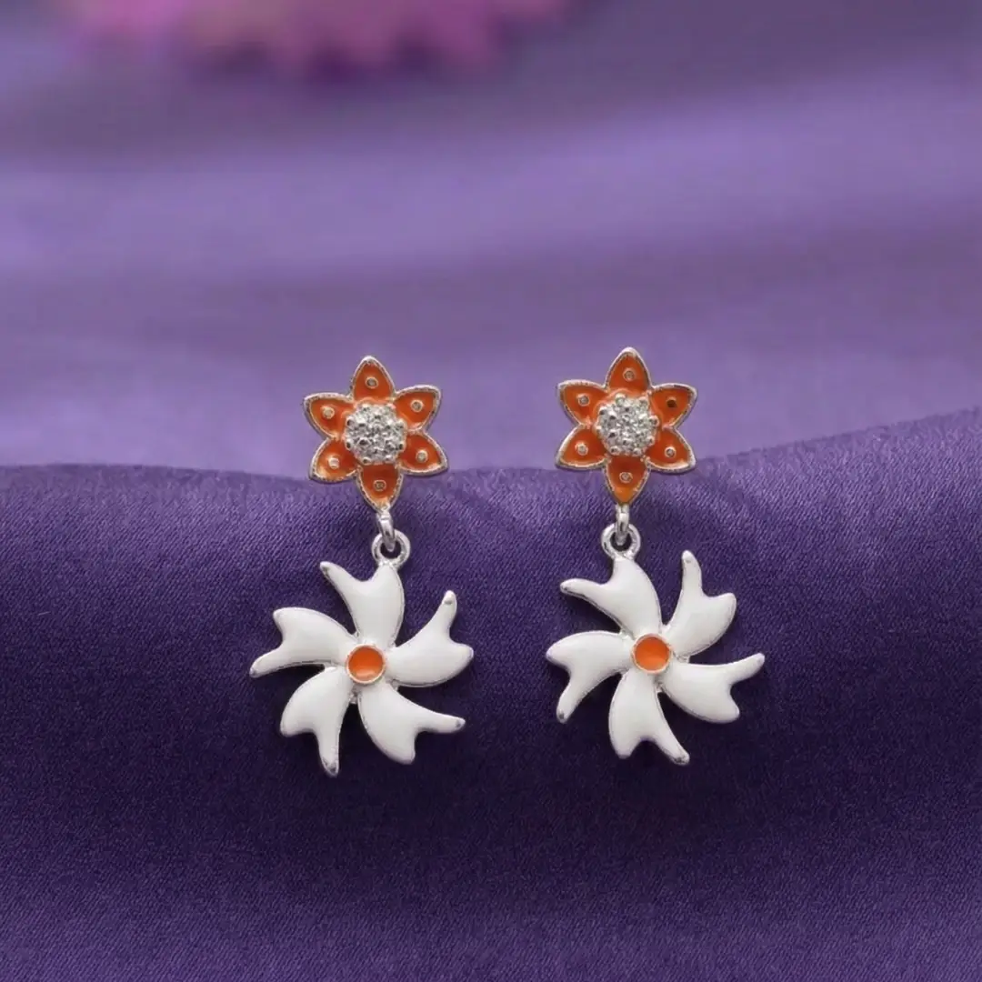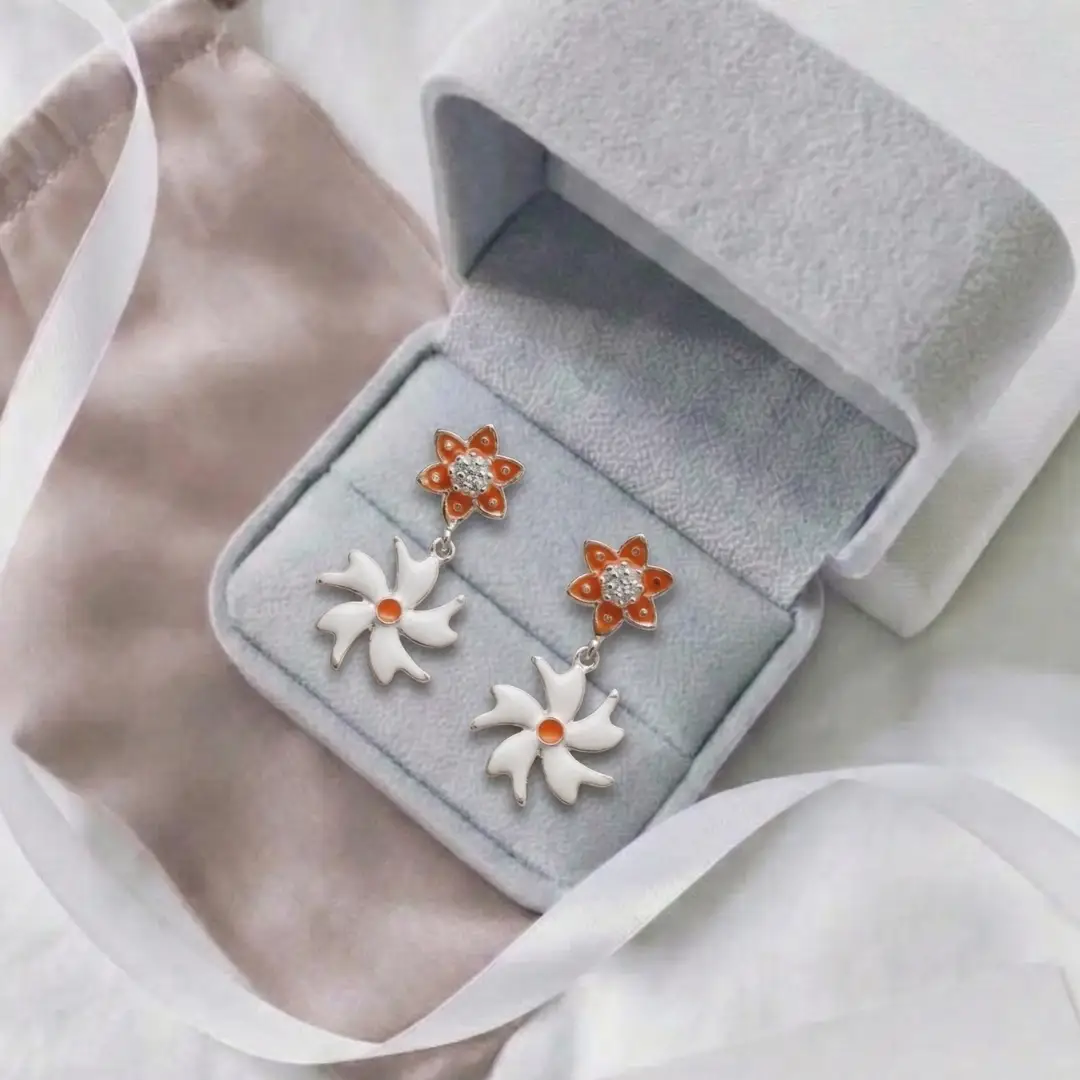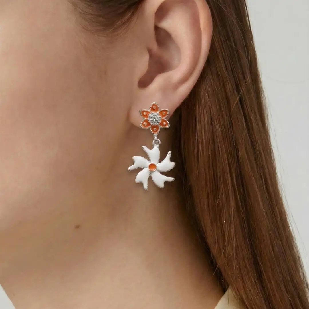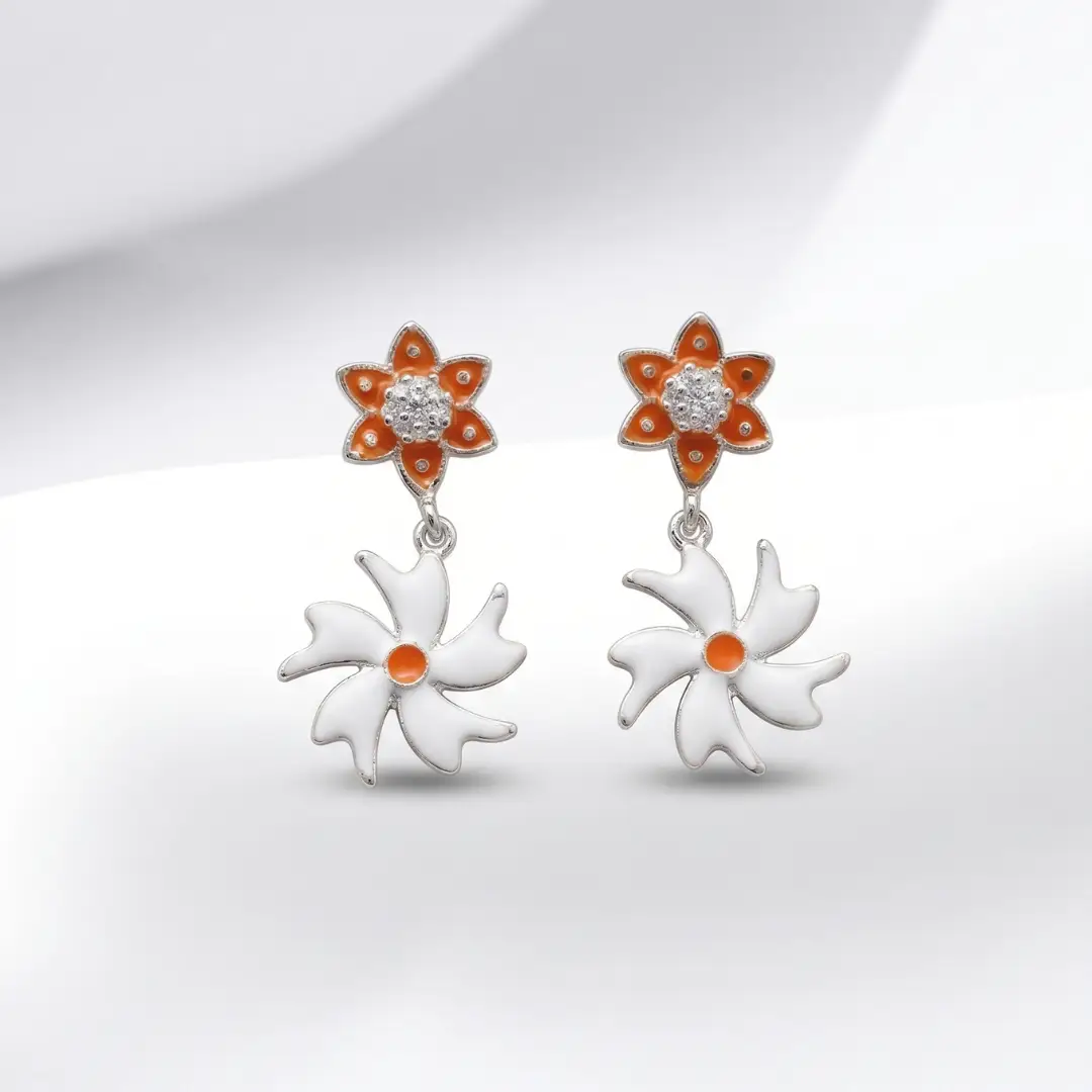 Add a touch of elegance and charm to your jewelry collection with these beautifully crafted 925 Silver Floral Drop Earrings from The Velvet Box. Designed with a stunning dual-flower pattern, these earrings feature a vibrant orange enamel flower stud paired with a delicate white floral drop, creating a perfect blend of modern and traditional style.