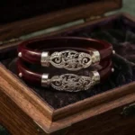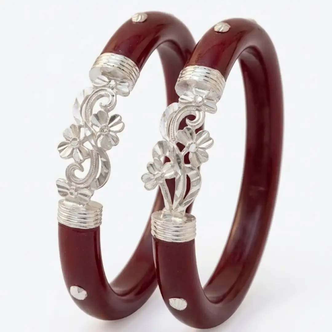 Embrace tradition with a touch of nature. These 925 Sterling Silver Pola Bangles feature an exquisite floral motif, handcrafted with precision. The deep red base contrasted with shimmering fine silver makes this set a must-have for every woman’s jewelry collection.