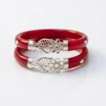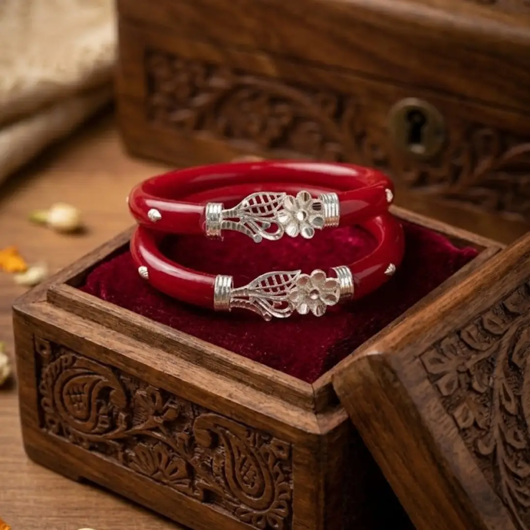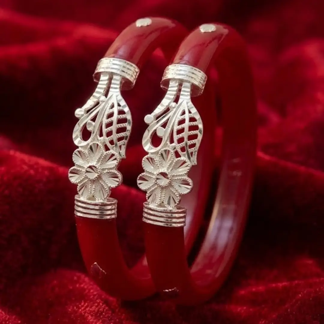 Celebrate traditional elegance with our latest 925 Sterling Silver Pola Bangle. This unique set features a stunning combination of a blooming flower and a delicate leaf motif, meticulously crafted in fine silver. The vibrant red base provides a striking contrast to the shimmering silver work, making it a standout piece for any occasion.