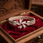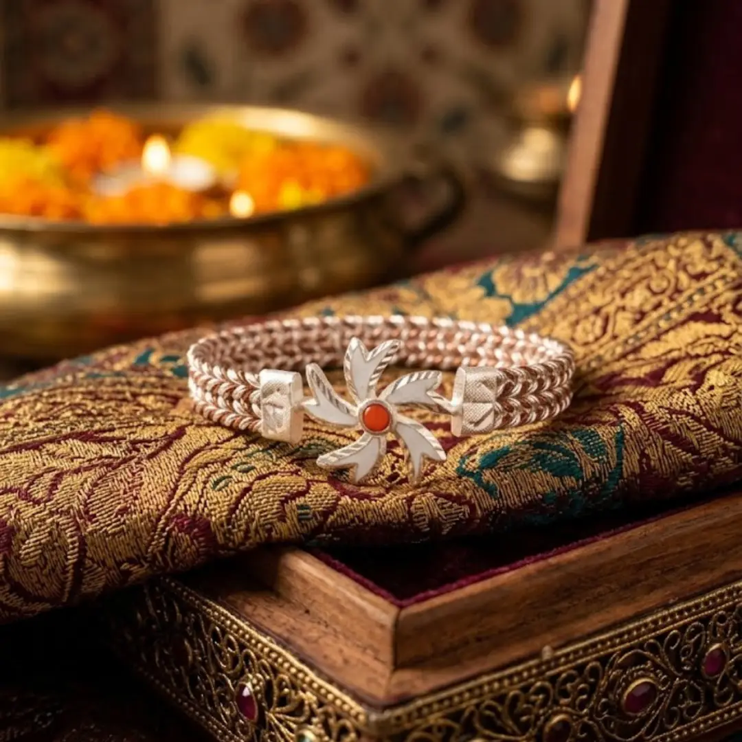 - Design: Floral ‘Sudarshan’ style motif with a red coral/stone center and intricate braided band.