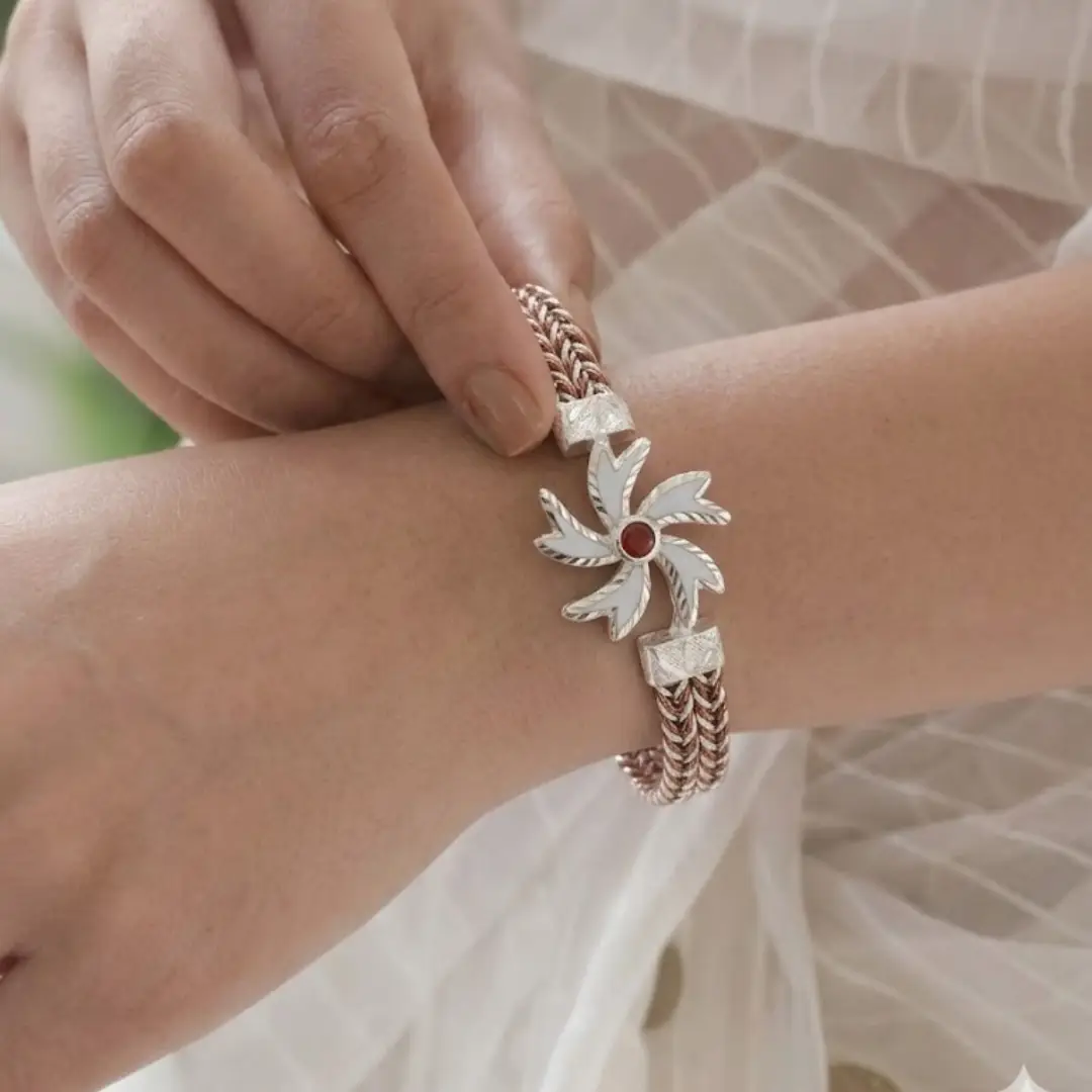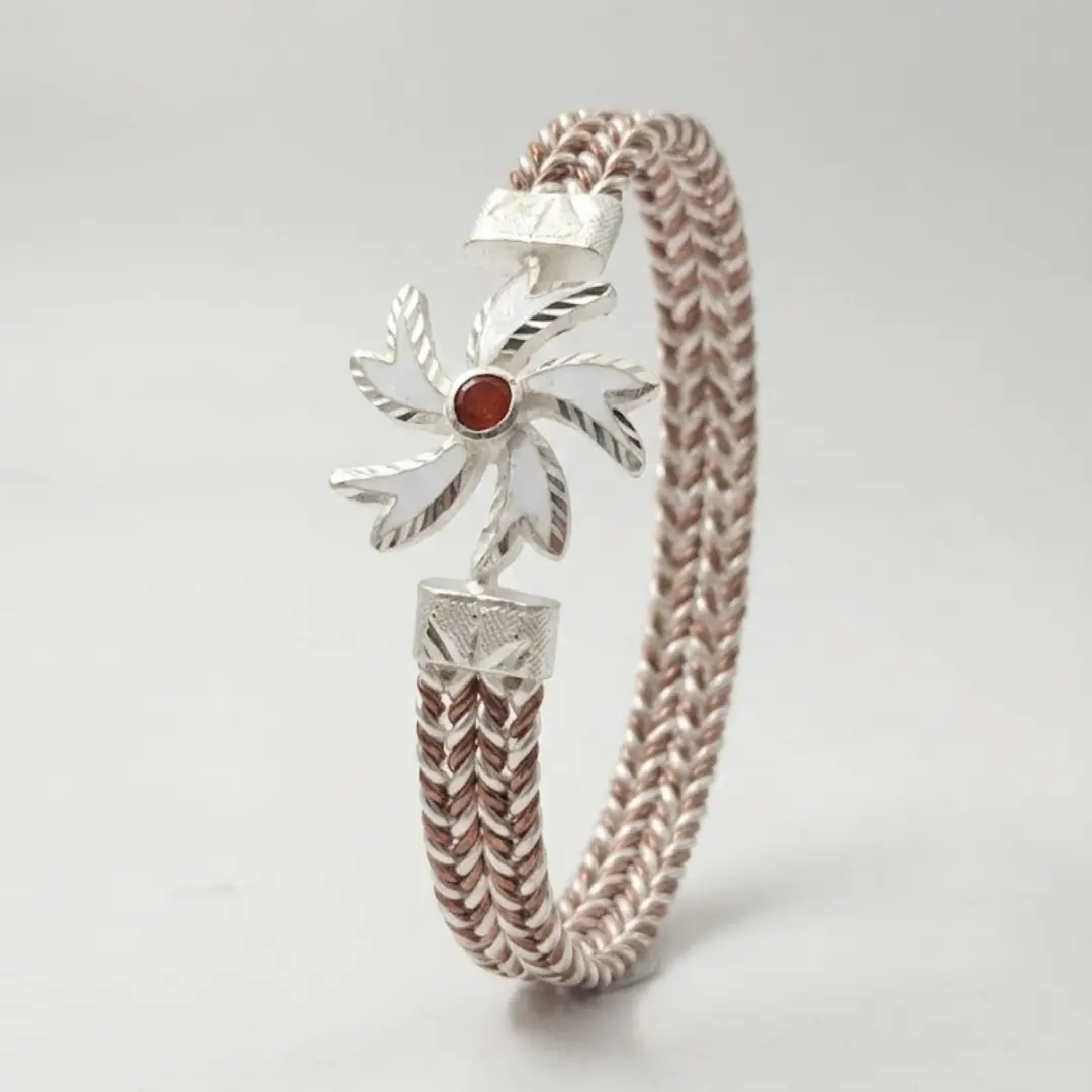 Make a bold style statement with the 925 Silver Flower Noya Bangle from The Velvet Box. This masterpiece features a traditional flower motif with a vibrant red center, elegantly mounted on a premium braided-style metallic band that ensures both durability and a luxury aesthetic.