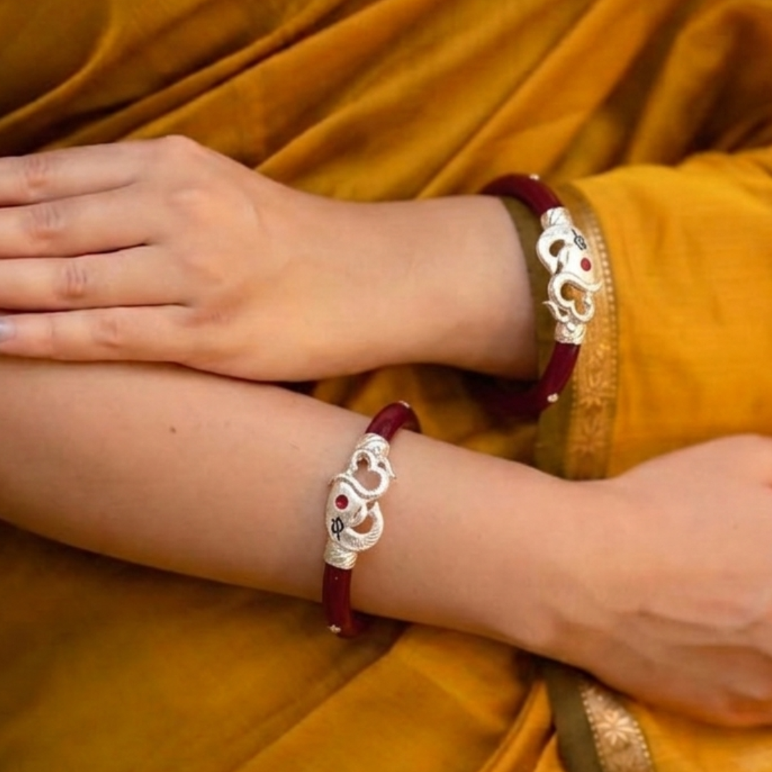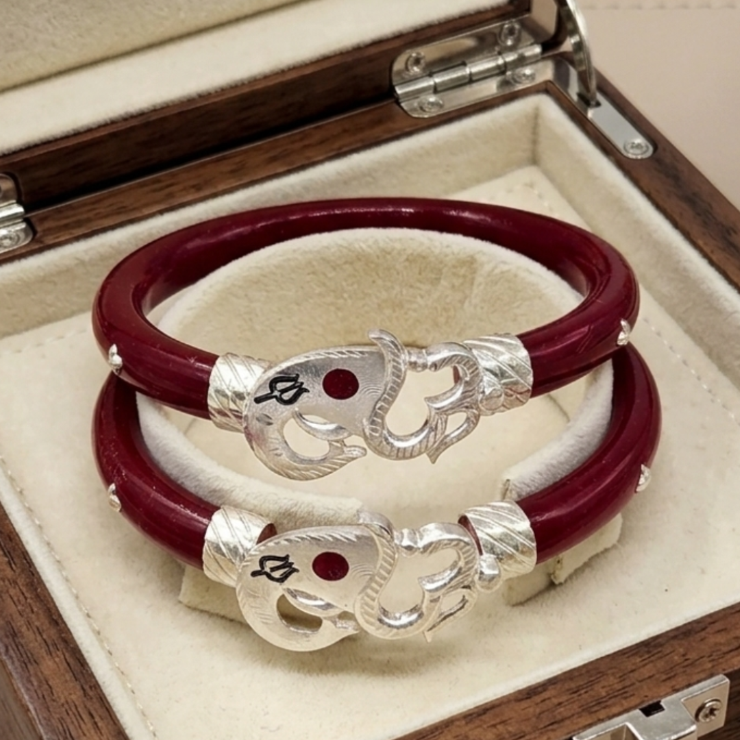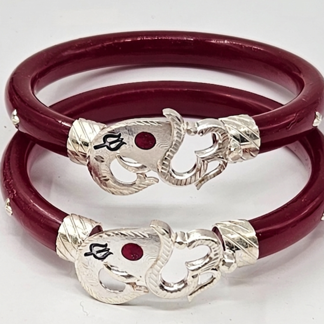 Invite prosperity and protection into your life with our exquisitely crafted 925 Silver Ganesha Pola Bangle. This spiritual masterpiece features deep maroon-red Pola adorned with intricate silver work depicting Lord Ganesha, the sacred Om symbol, and the powerful Trishul. It is the perfect fusion of traditional Bengali heritage and divine craftsmanship, designed for women who cherish spiritual elegance.