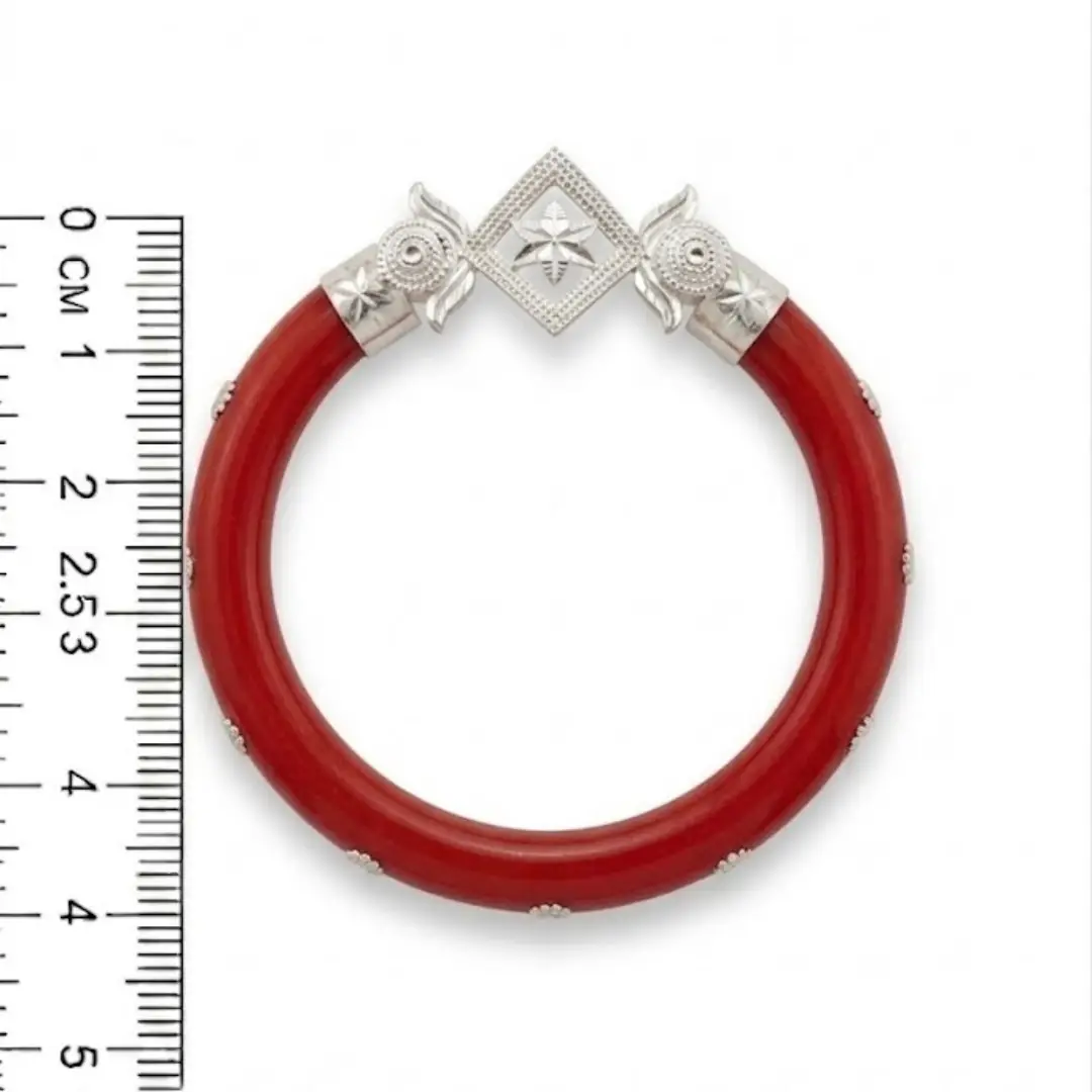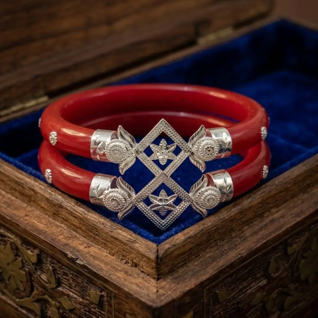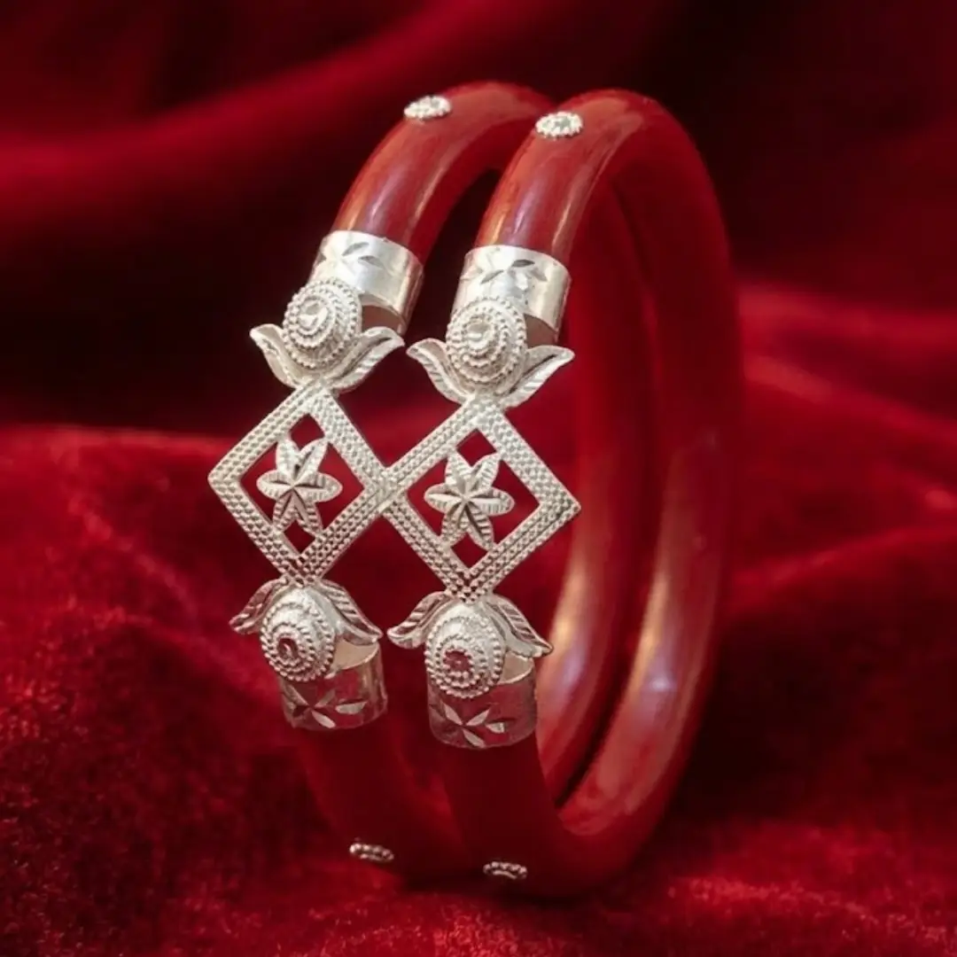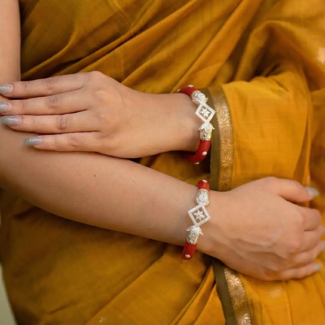Elevate your ethnic wardrobe with a touch of modern geometry. Our 925 Silver Geometric Pola Bangle features a bold red Pola base paired with intricate sterling silver work. The centerpiece showcases a unique square mesh pattern with a central star motif, blending traditional Bengali artistry with a contemporary silhouette that appeals to the modern woman.