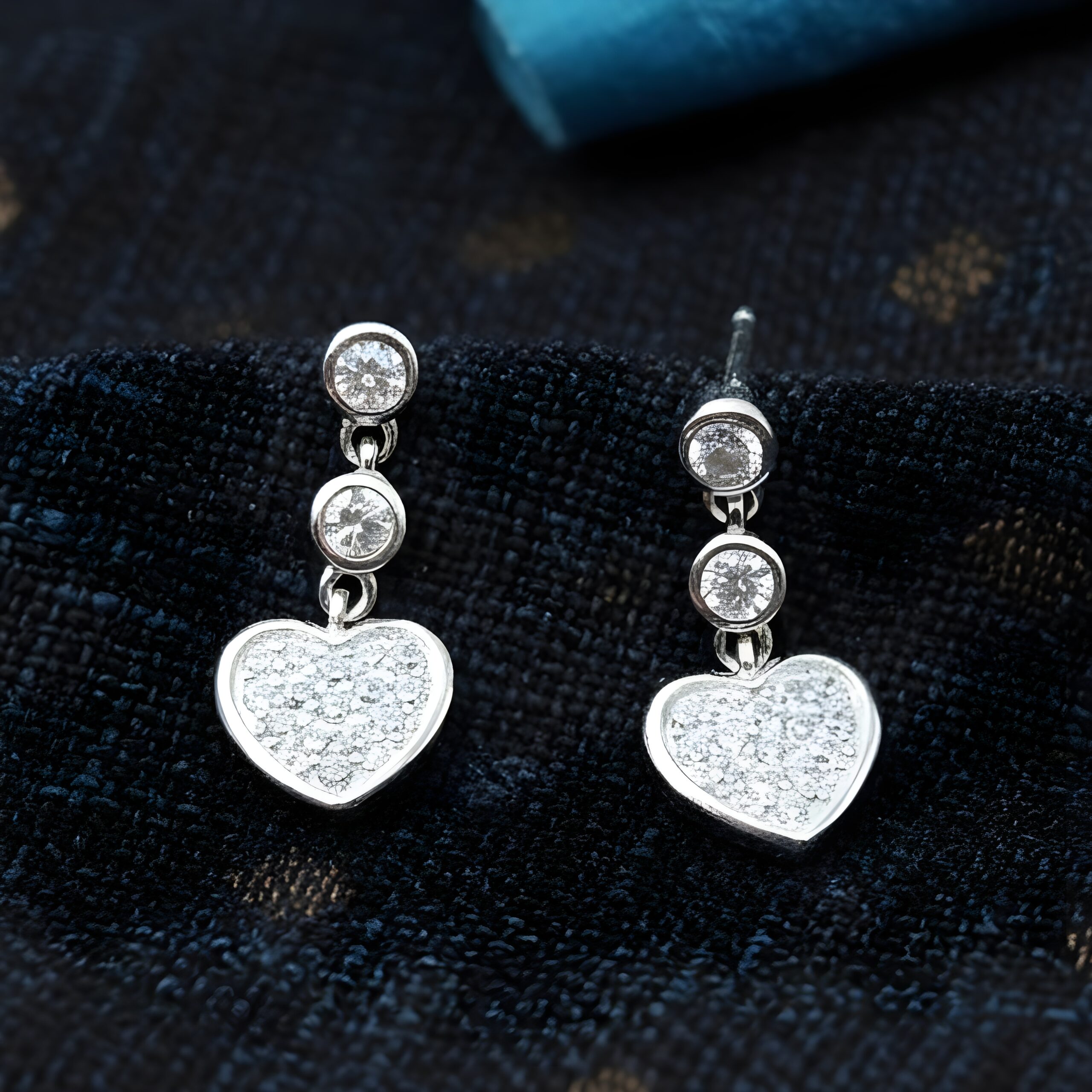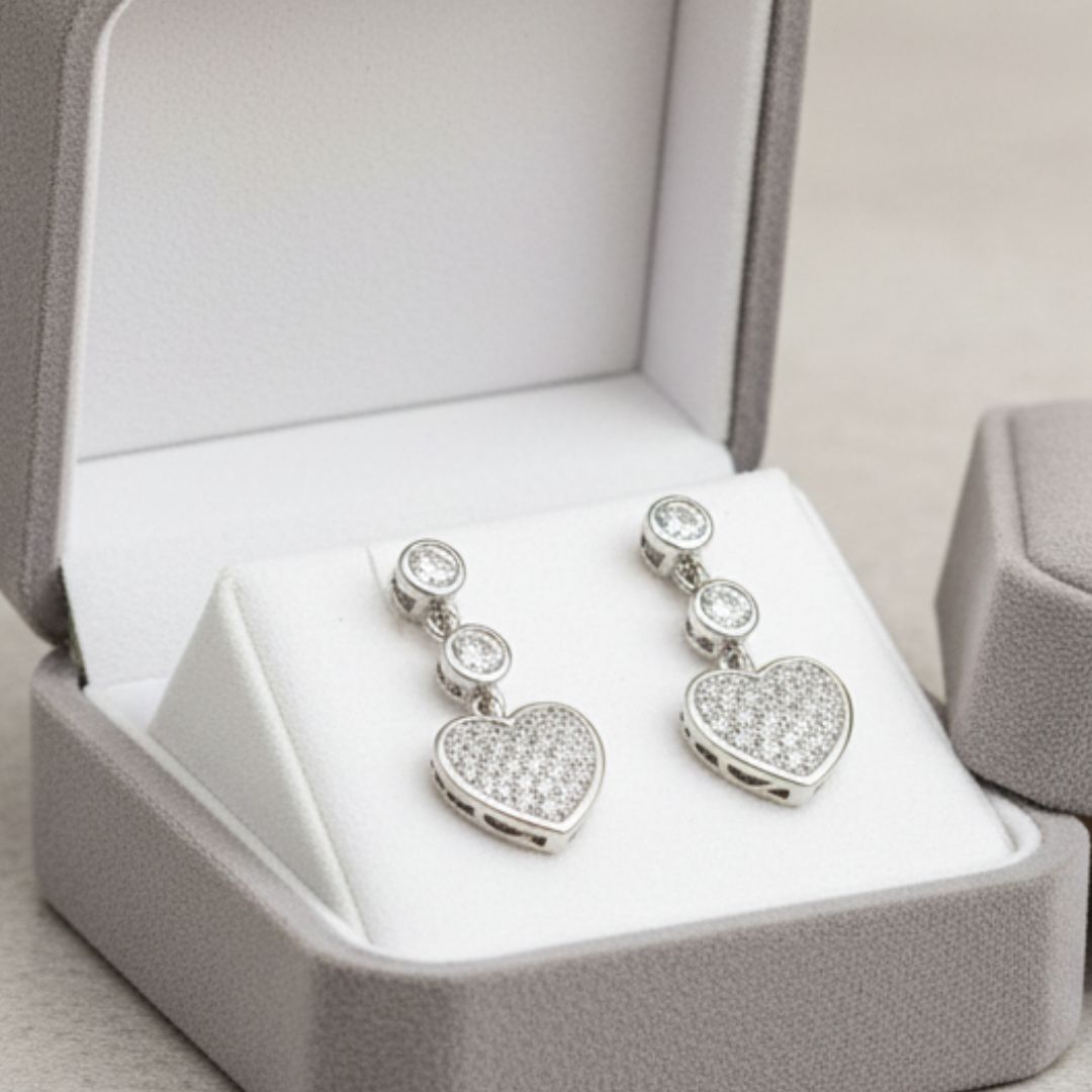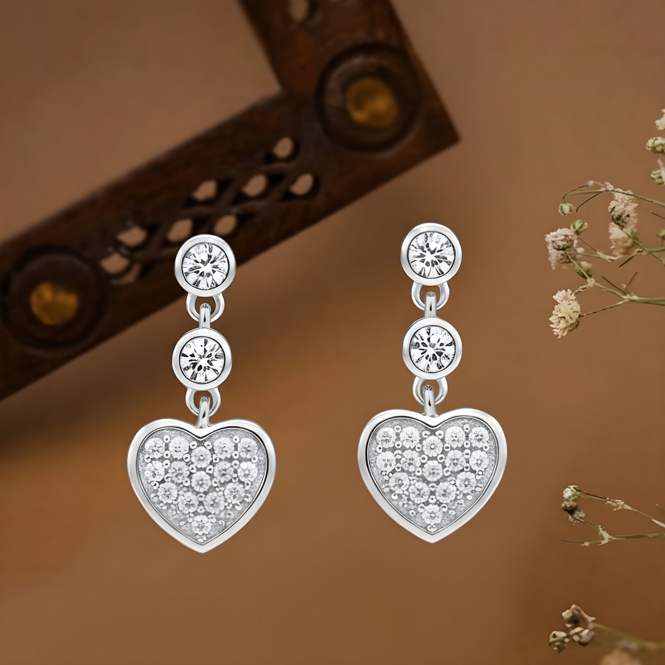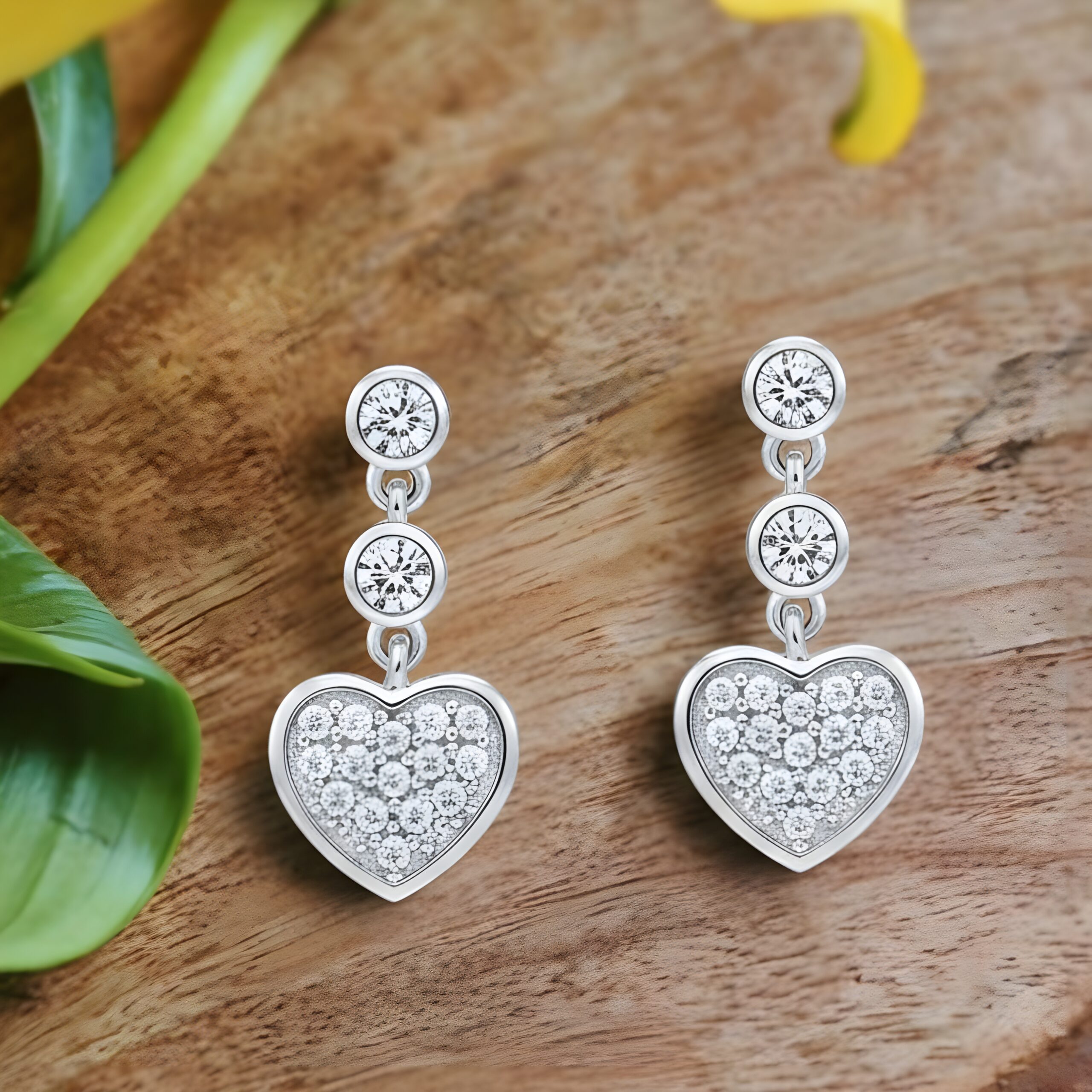 Add timeless sparkle to your look with these 925 sterling silver heart drop earrings, crafted to embody elegance and romance. Each earring features two brilliant round-cut cubic zirconia stones, leading to a beautifully pave-set heart charm that captures light from every angle.