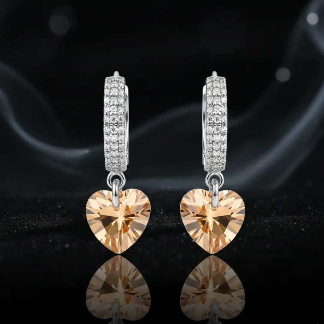 Radiate warmth and sophistication with these 925 sterling silver huggie hoop earrings, featuring elegant champagne-colored heart-cut crystals. Each crystal is expertly faceted to reflect light beautifully, creating a soft golden sparkle that complements any skin tone. The hoops are adorned with shimmering pave-set cubic zirconia, offering a luxurious touch without being overpowering.