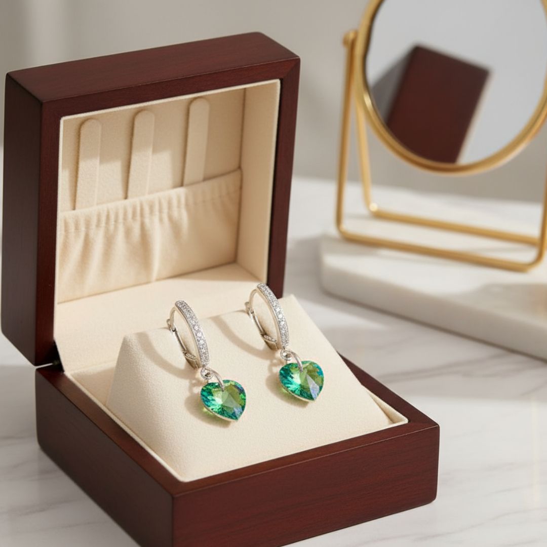 Adorned with green aurora heart-cut crystals that shimmer beautifully
