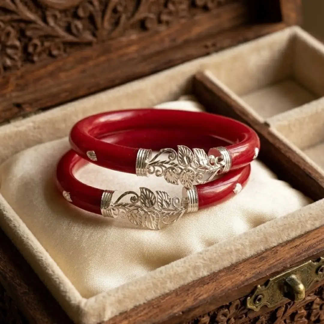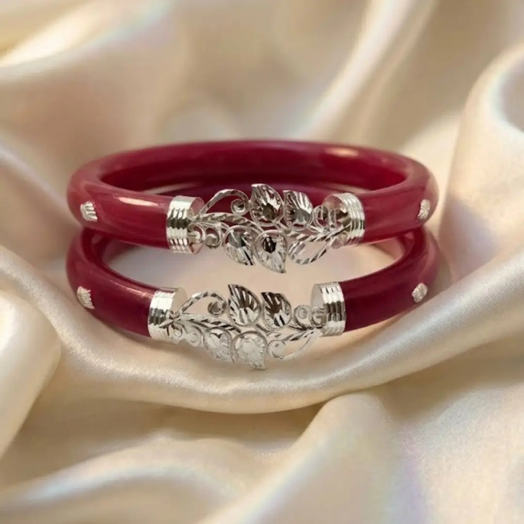 Experience a new level of traditional elegance with our latest 925 Sterling Silver Pola Bangle collection. This unique set showcases an intricate leaf cluster motif paired with delicate floral accents, meticulously handcrafted in fine silver. The high-polish silver work sits beautifully on a deep, vibrant red base, creating a striking contrast that defines premium ethnic jewelry.