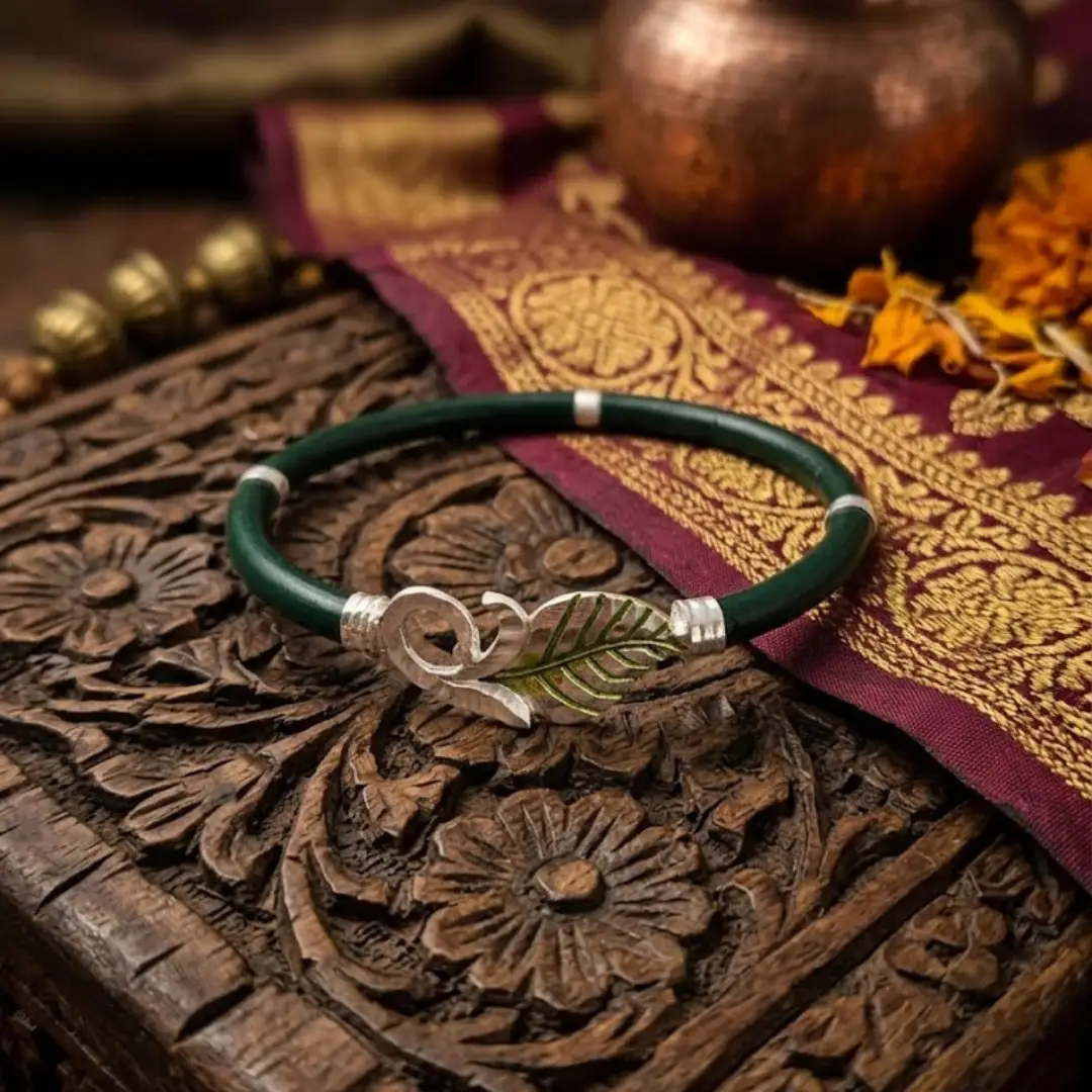 Perfect for daily wear or as a meaningful gift, this Noya bangle blends traditional protection with contemporary style. The intricate veins of the silver leaf are polished to a high shine, creating a striking contrast with the dark band. Crafted from high-purity silver, it is designed to be comfortable and skin-friendly for long-lasting wear.