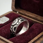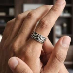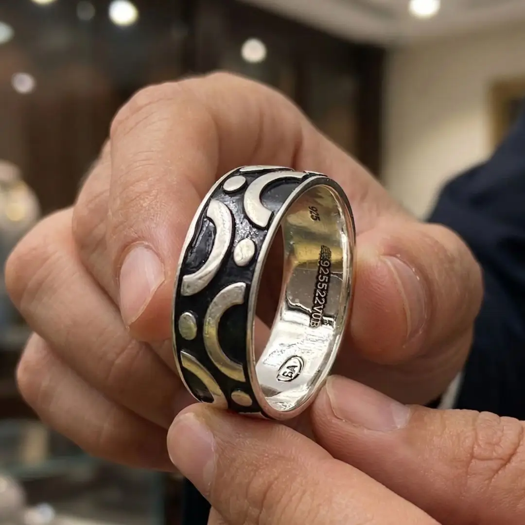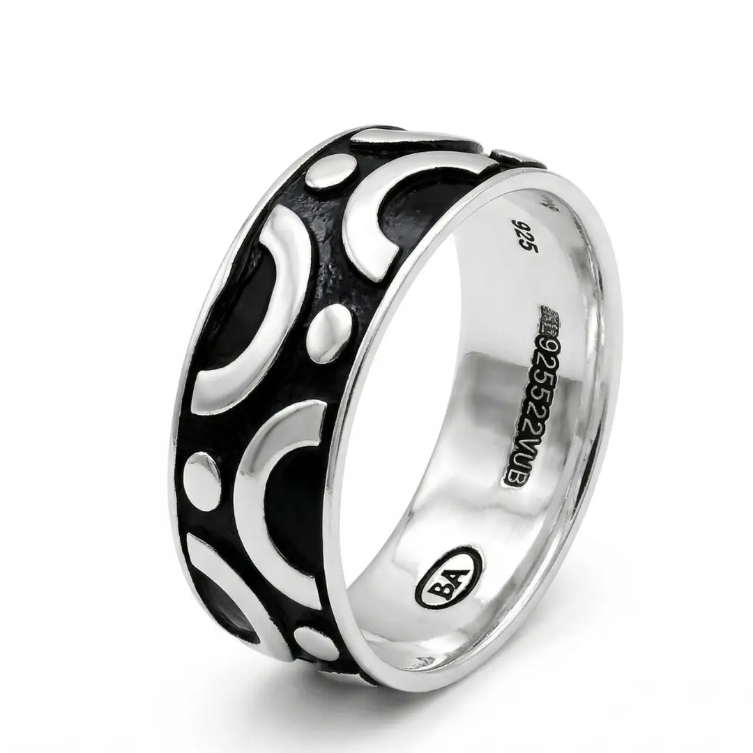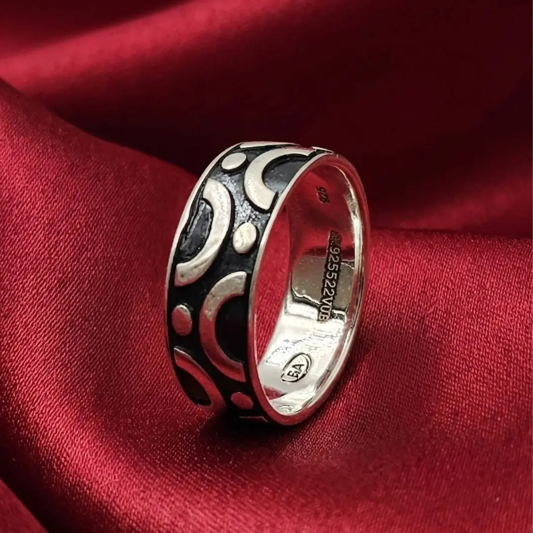 Add a touch of designer flair to your collection with our 925 Sterling Silver Men’s Band. This artisan-crafted piece features a distinctive repeating pattern of polished silver crescents and circular studs, boldly contrasted against a dark, textured oxidized background. The wide-band design offers a masculine presence while maintaining a sleek, low-profile fit.