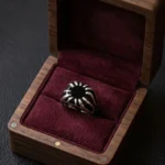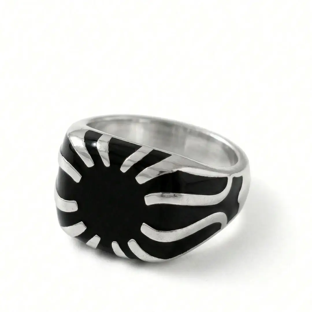 Make a powerful impression with our 925 Sterling Silver Men’s Ring, featuring a captivating sunburst motif. This statement piece showcases a central black enamel core from which polished silver “rays” radiate outward, creating a dynamic solar flare effect. The sleek, curved profile of the ring ensures it sits comfortably on the finger while providing a high-contrast, artistic look.
