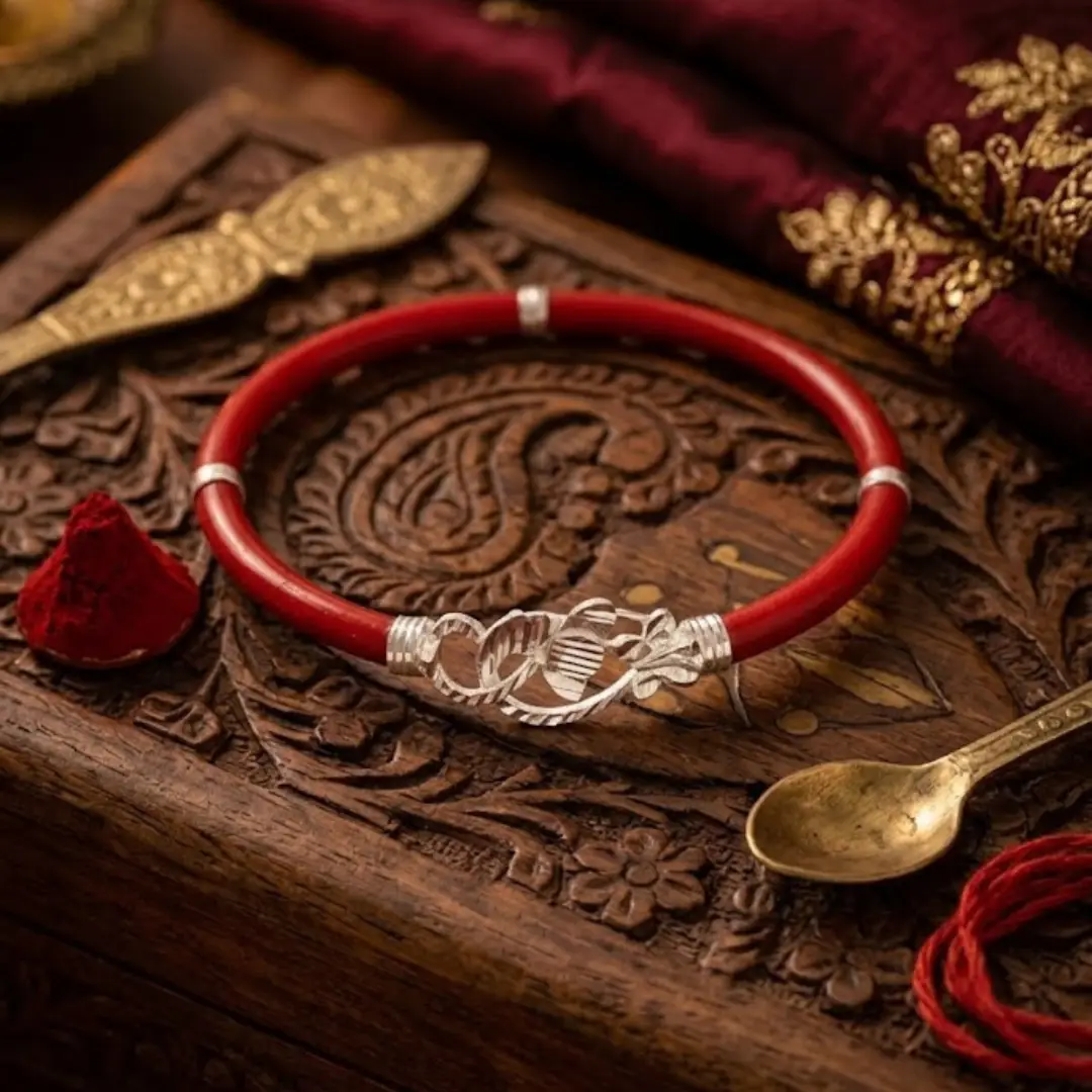 Whether it’s a gift for a loved one or a treat for yourself, this silver bangle stands out for its craftsmanship. The contrast between the deep red and the shimmering silver makes it a versatile accessory for both ethnic and contemporary outfits.