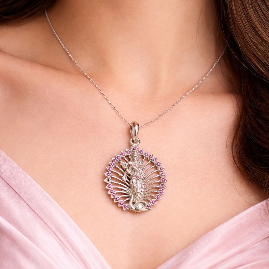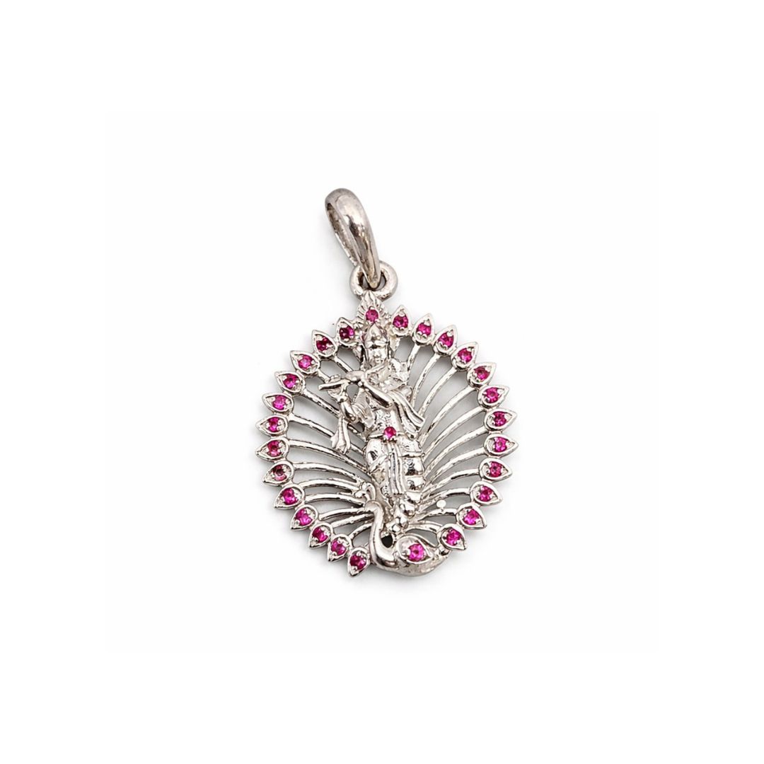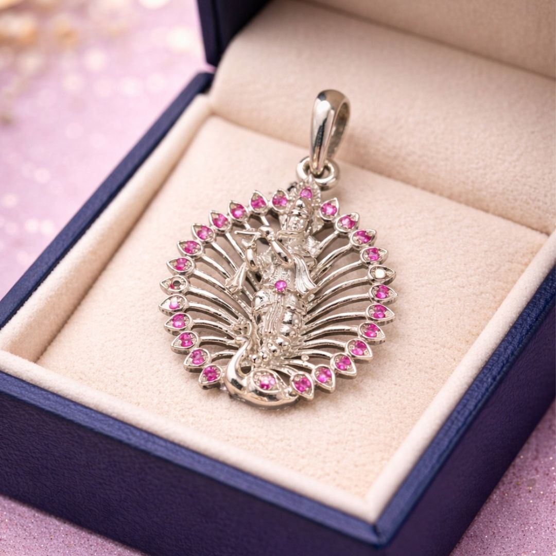 Add a touch of celestial charm to your jewelry box with our exquisitely crafted 925 Silver Peacock Krishna Pendant. This unique piece features Lord Krishna playing his flute, beautifully framed by a stone-studded peacock feather motif. Crafted from premium Fine 925 Silver and adorned with vibrant ruby-colored accents, this pendant is designed for women and girls who value intricate spiritual jewelry.