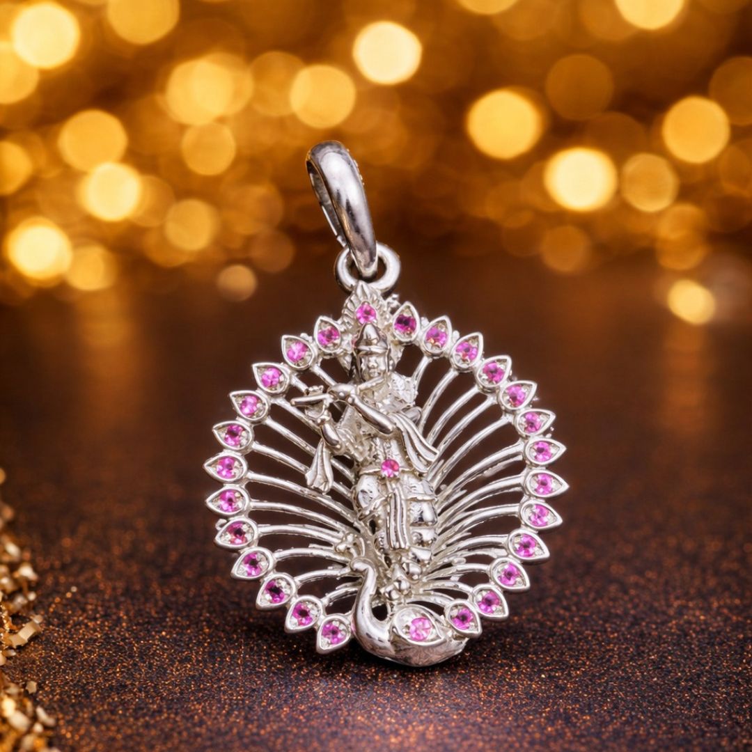 Divine Artistry: Pure 925 Silver Peacock Krishna Pendant with Pink Stones