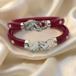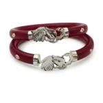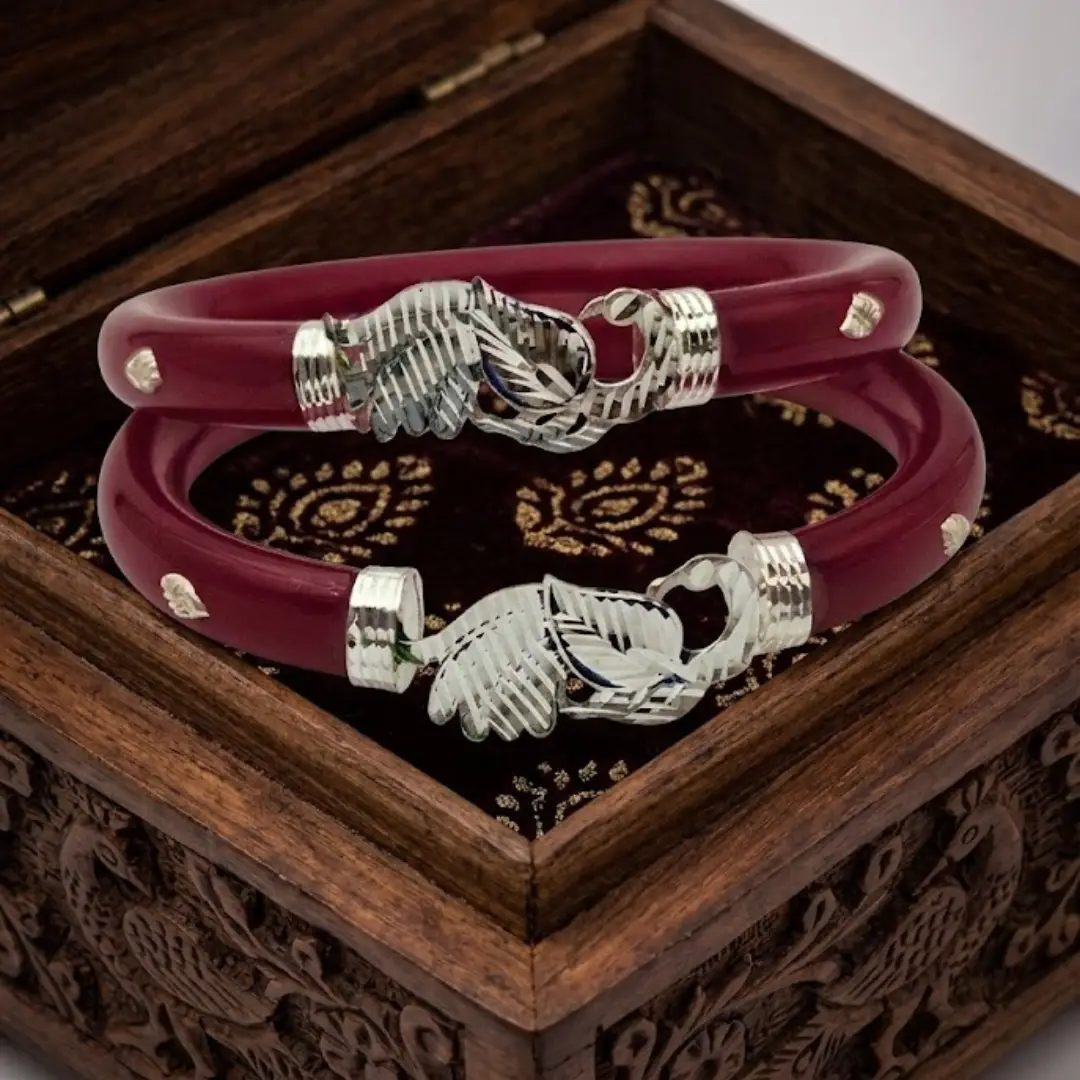 Elevate your jewelry collection with our most exquisite 925 Silver Pola Bangle. This designer piece features a stunning handcrafted peacock motif. Furthermore, our artisans engrave intricate details directly into the fine silver. We set this brilliant silver work against a rich, dark red Pola base. Consequently, the bangle offers a luxurious take on traditional Bengali craftsmanship.