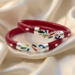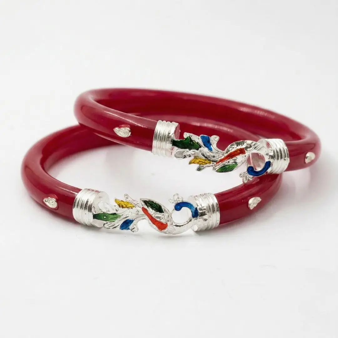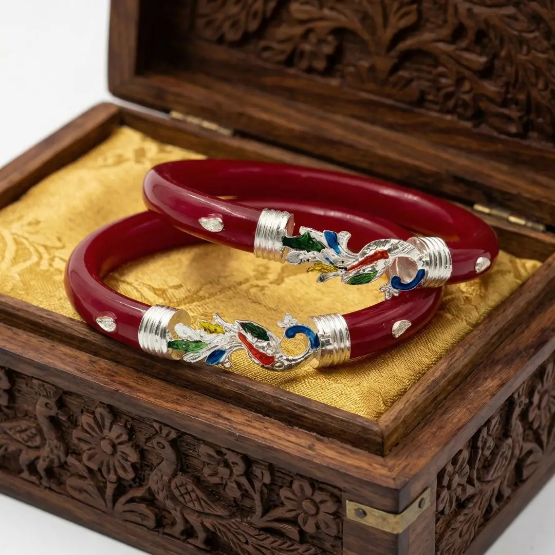 the ultimate blend of tradition and craftsmanship with our exclusive 925 Silver Pola Bangle collection by The Velvet Box. These bangles feature iconic Bengali red pola paired with intricately handcrafted silver motifs. From playful nature-inspired patterns to regal ethnic symbols, each piece is a masterpiece of fine silver jewelry.