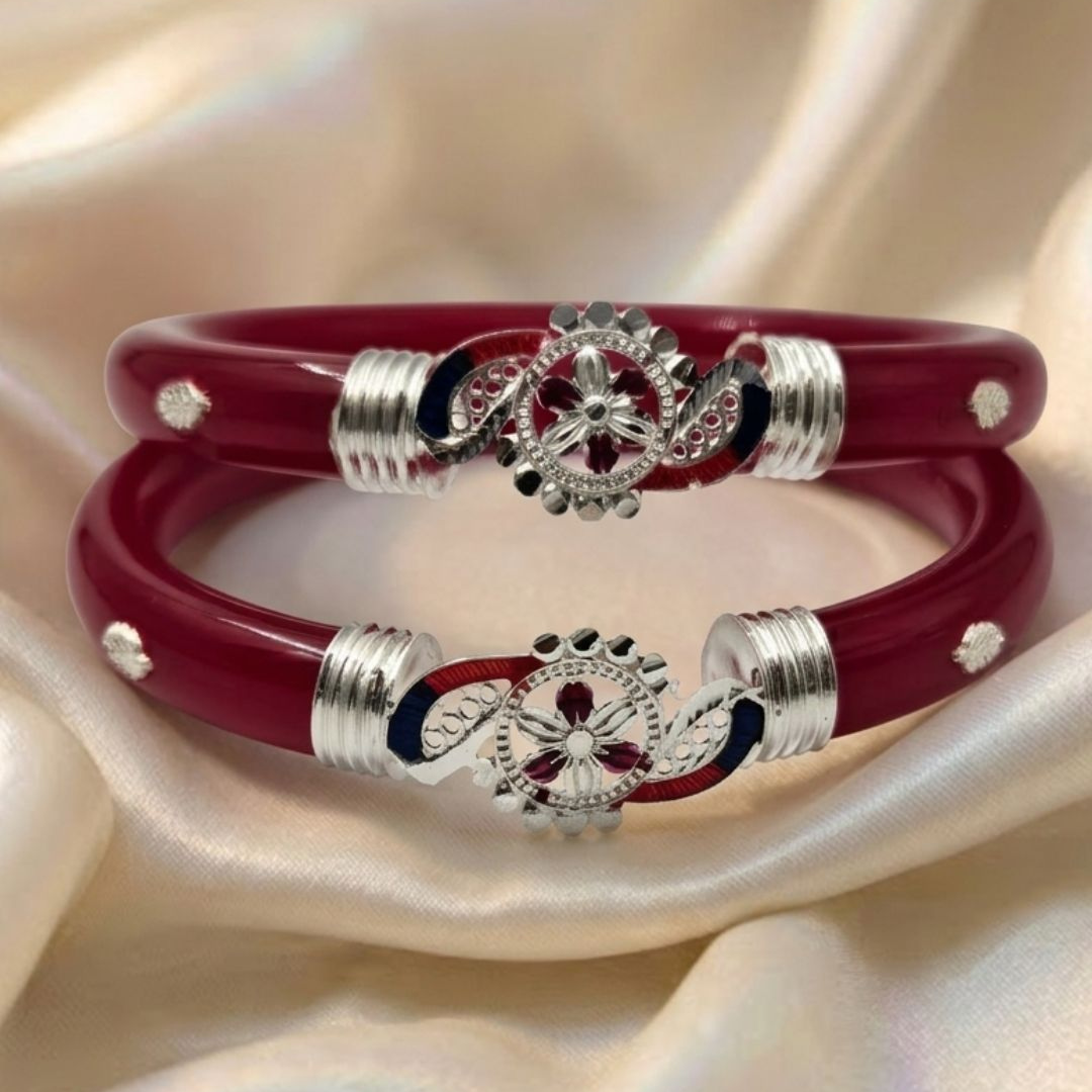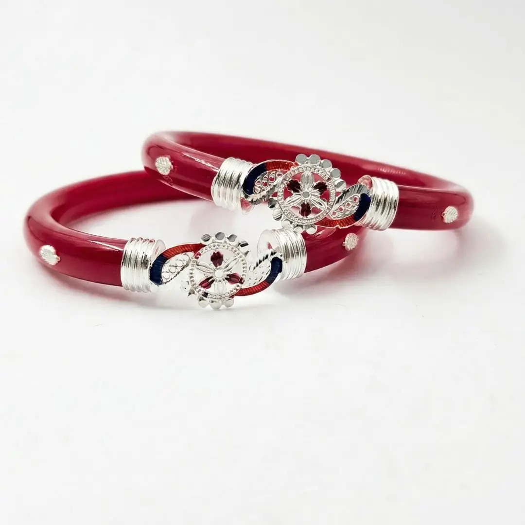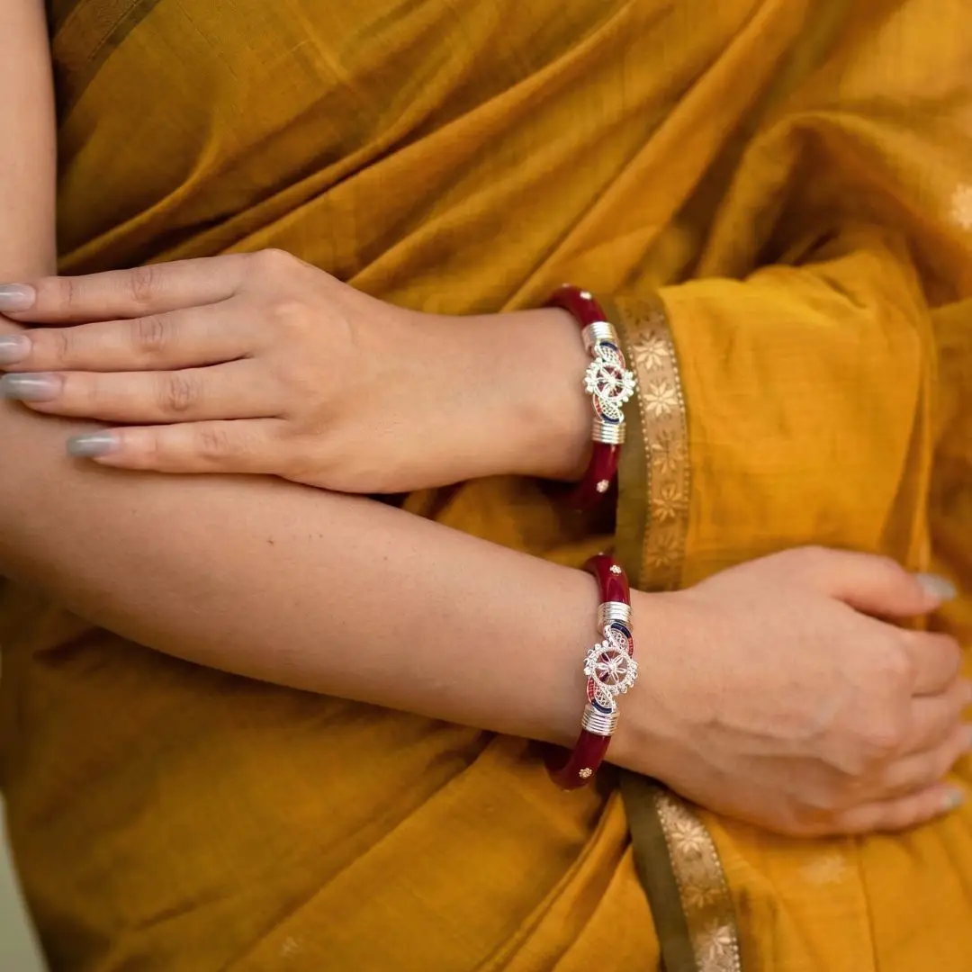Experience the ultimate blend of tradition and craftsmanship with our exclusive 925 Silver Pola Bangle collection by The Velvet Box. These bangles feature iconic Bengali red pola paired with intricately handcrafted silver motifs. From playful nature-inspired patterns to regal ethnic symbols, each piece is a masterpiece of fine silver jewelry.