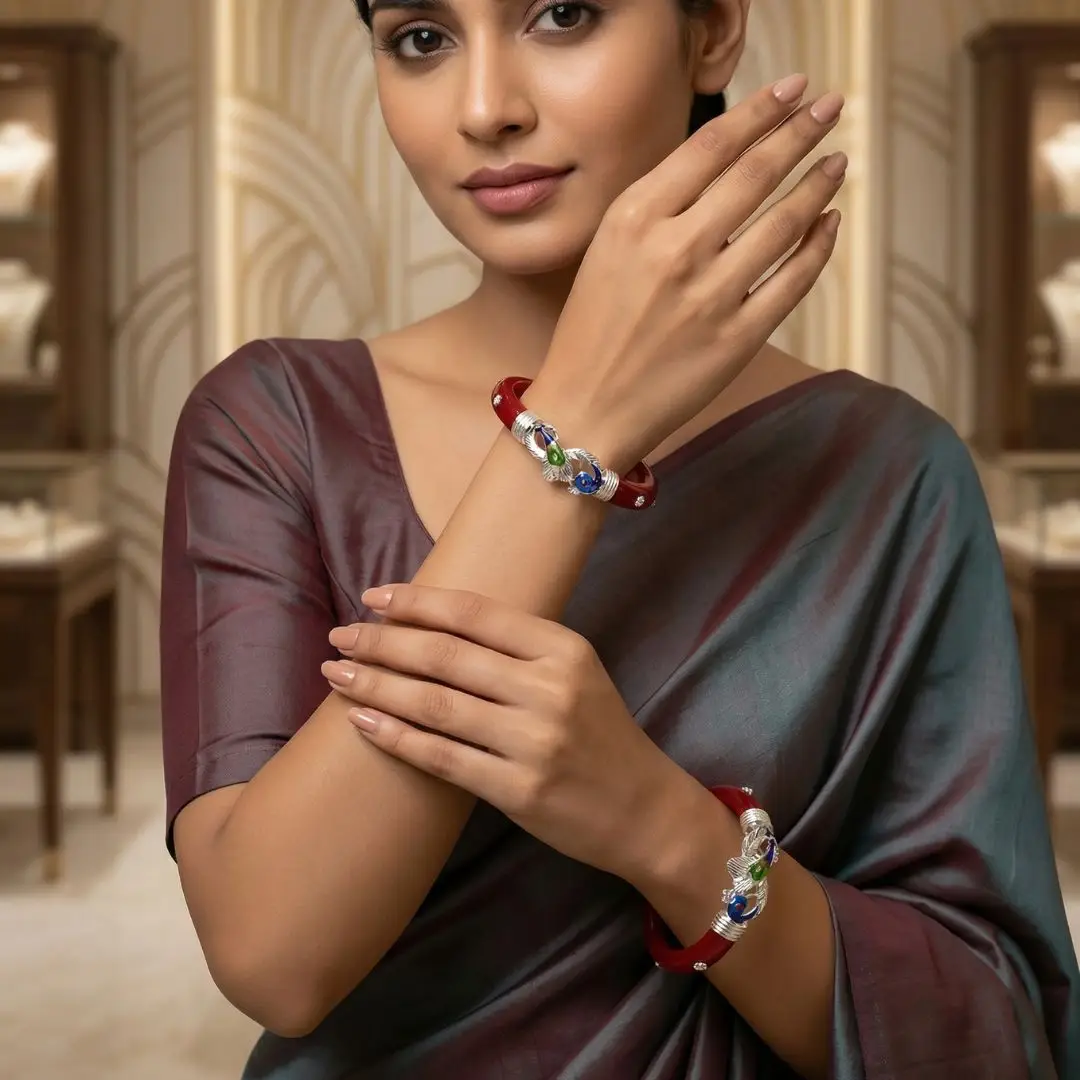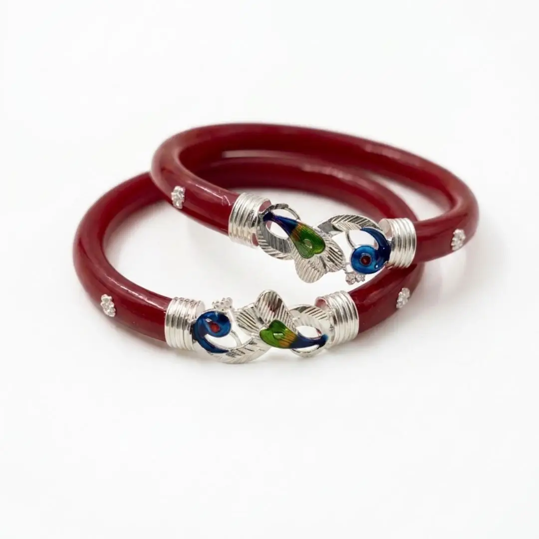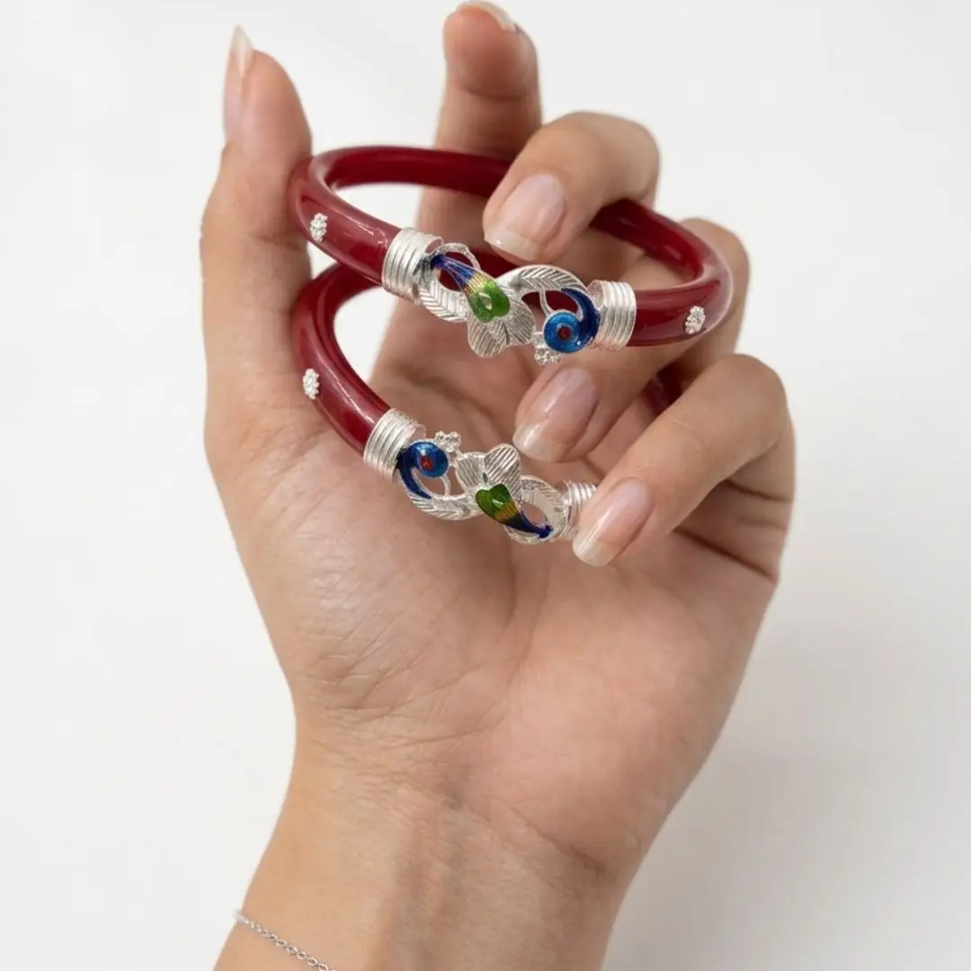 Experience the ultimate blend of tradition and craftsmanship with our exclusive 925 Silver Pola Bangle collection by The Velvet Box. These bangles feature iconic Bengali red pola paired with intricately handcrafted silver motifs. Whether you choose the playful Butterfly design, the majestic Peacock with colorful stones, or the classic Blue-Green Peacock motif, each piece tells a story of elegance.