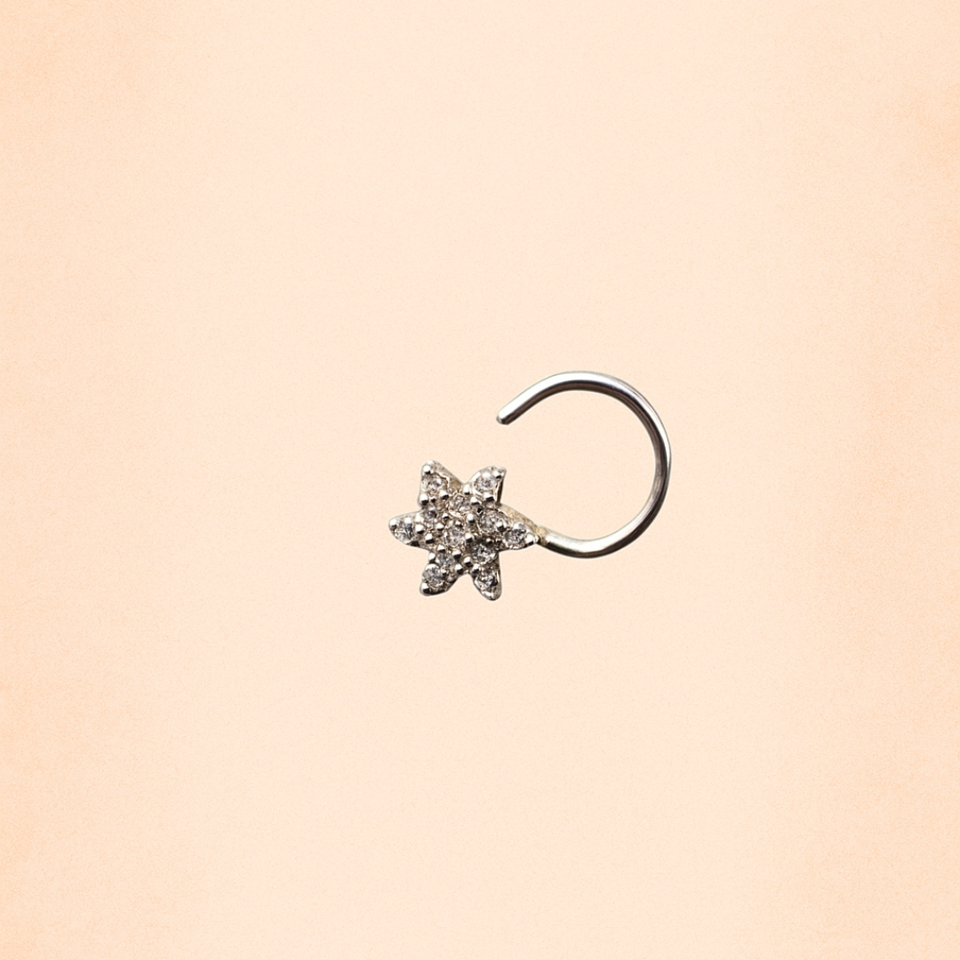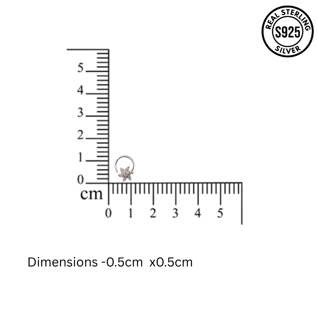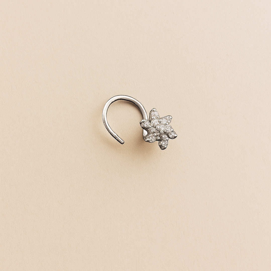 Bring a touch of sparkle to your look with this 925 Sterling Silver Sparkling Floral Nose Pin. Designed with a delicate flower shape adorned with shimmering stones, this nose pin adds elegance and grace to any outfit. Crafted from pure sterling silver, it ensures long-lasting shine, comfort, and skin safety. Perfect for everyday wear or festive occasions, this timeless piece highlights your natural beauty effortlessly.
