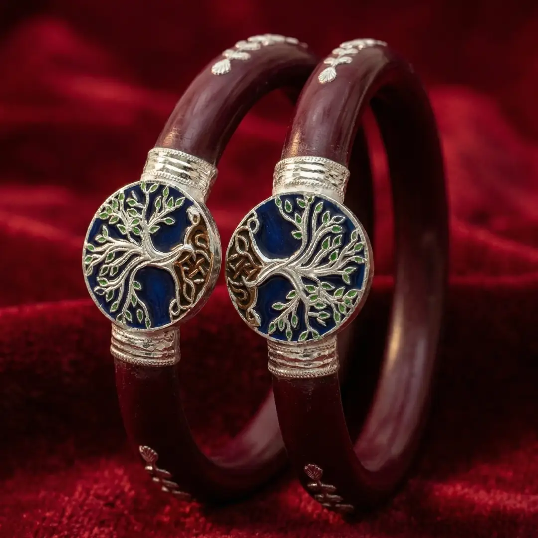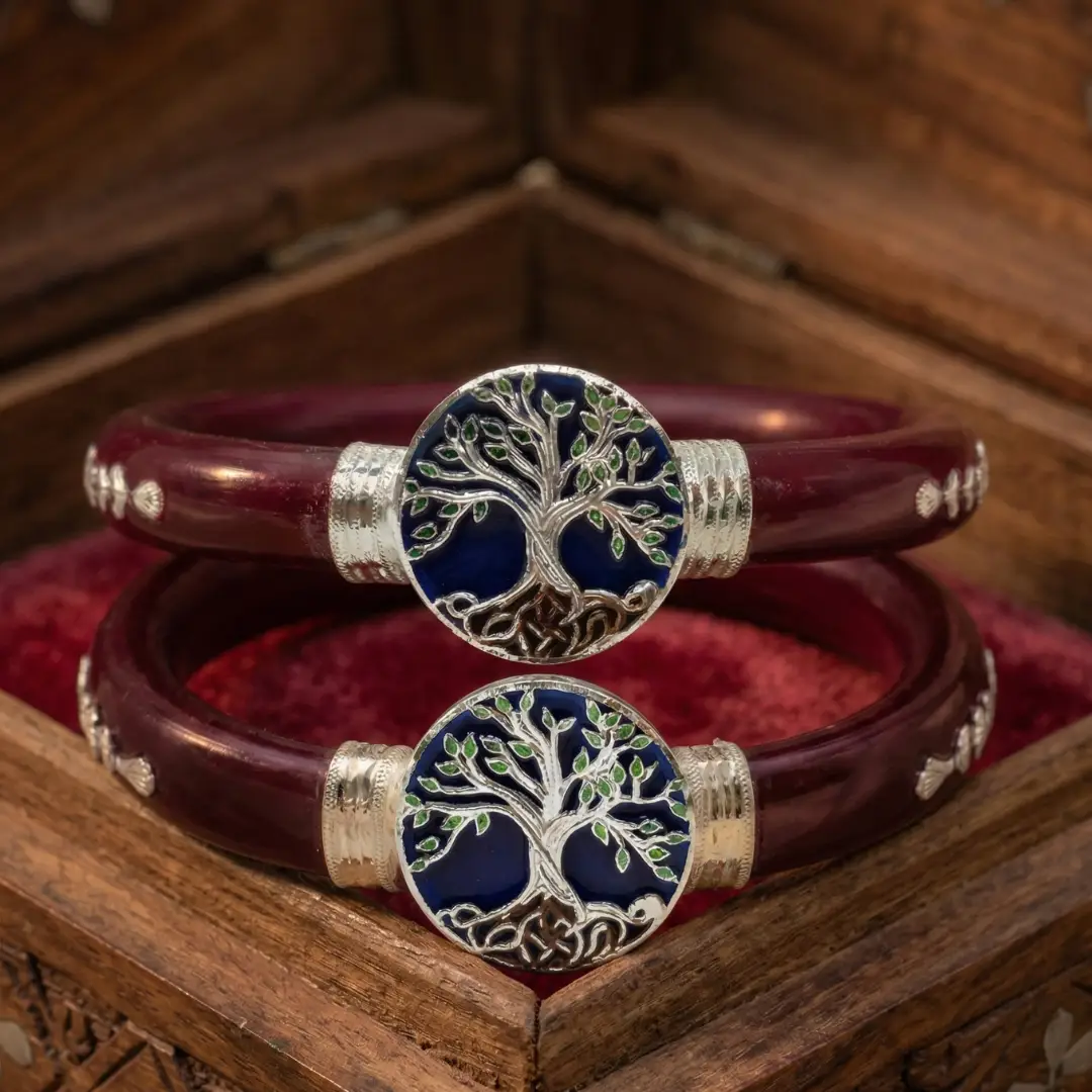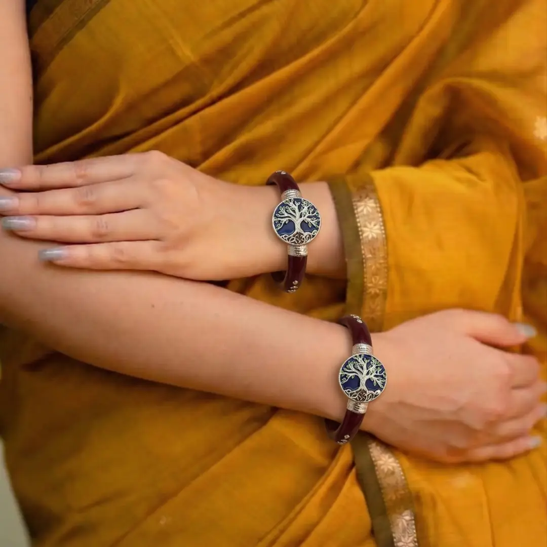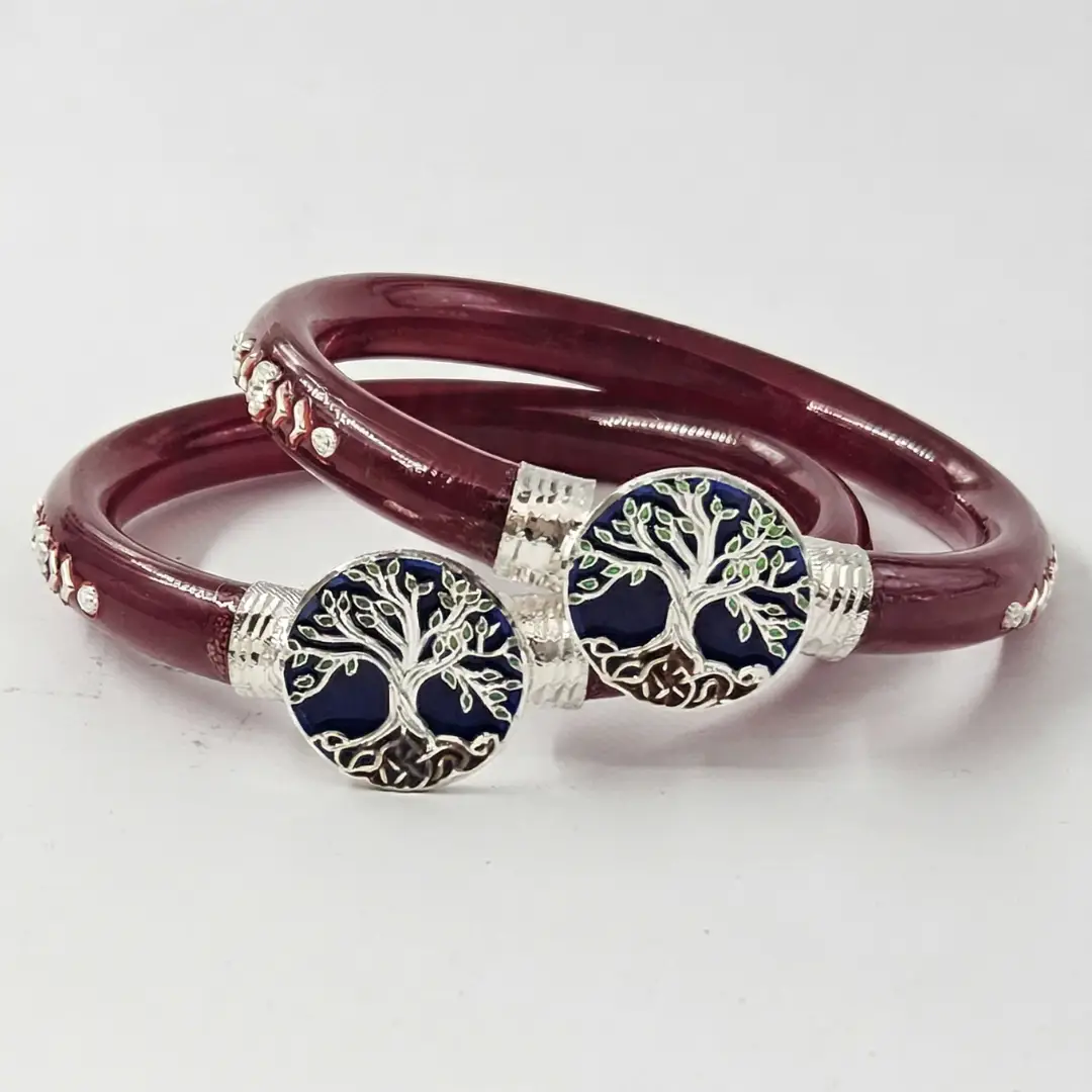 Embrace the symbol of growth and heritage with our 925 Silver Tree of Life Pola Bangle. This elegant piece features a rich, deep maroon base that provides a sophisticated backdrop for the circular sterling silver medallions. At the center of each medallion is a meticulously detailed “Tree of Life” with vibrant blue and green enamel accents, representing connection, strength, and timeless beauty.