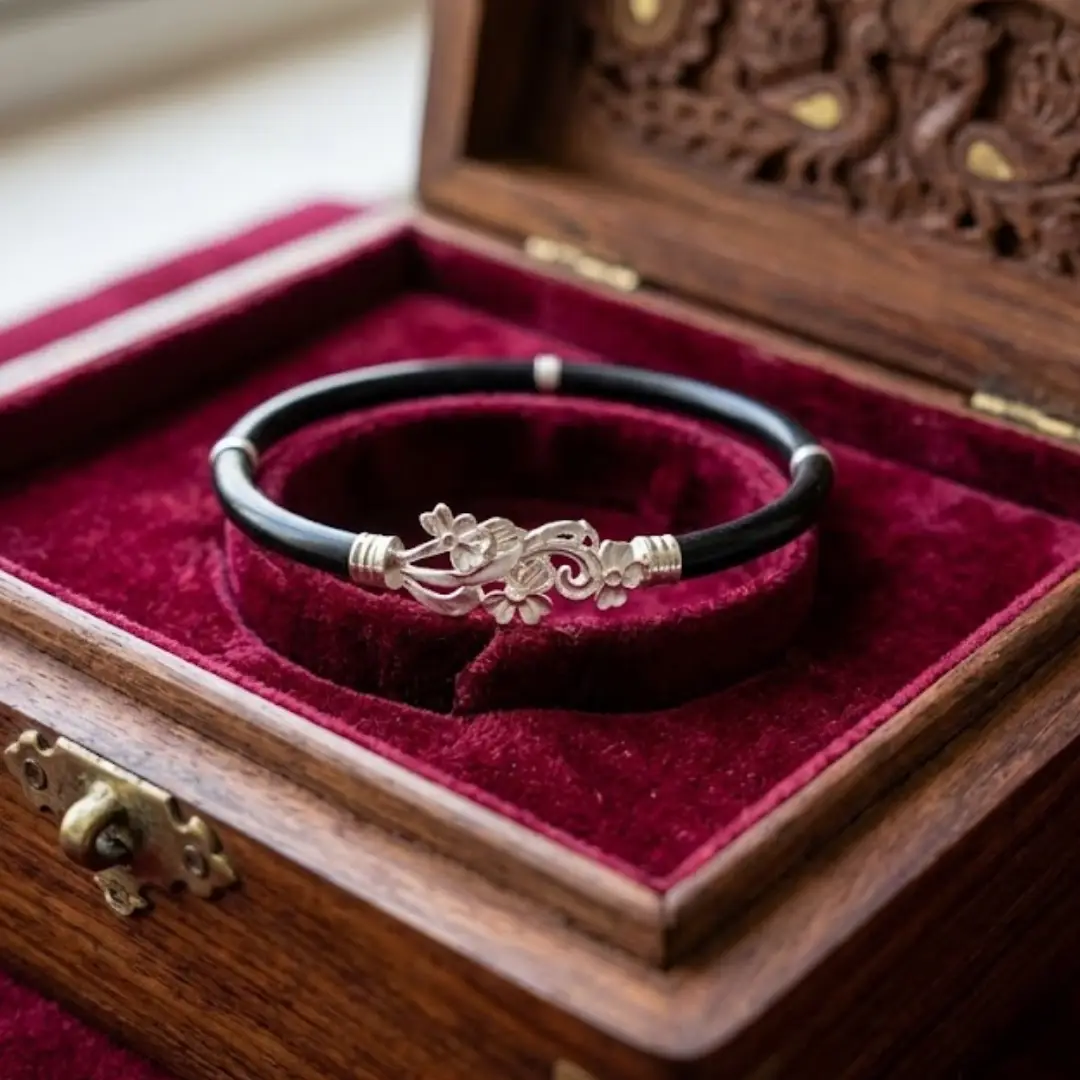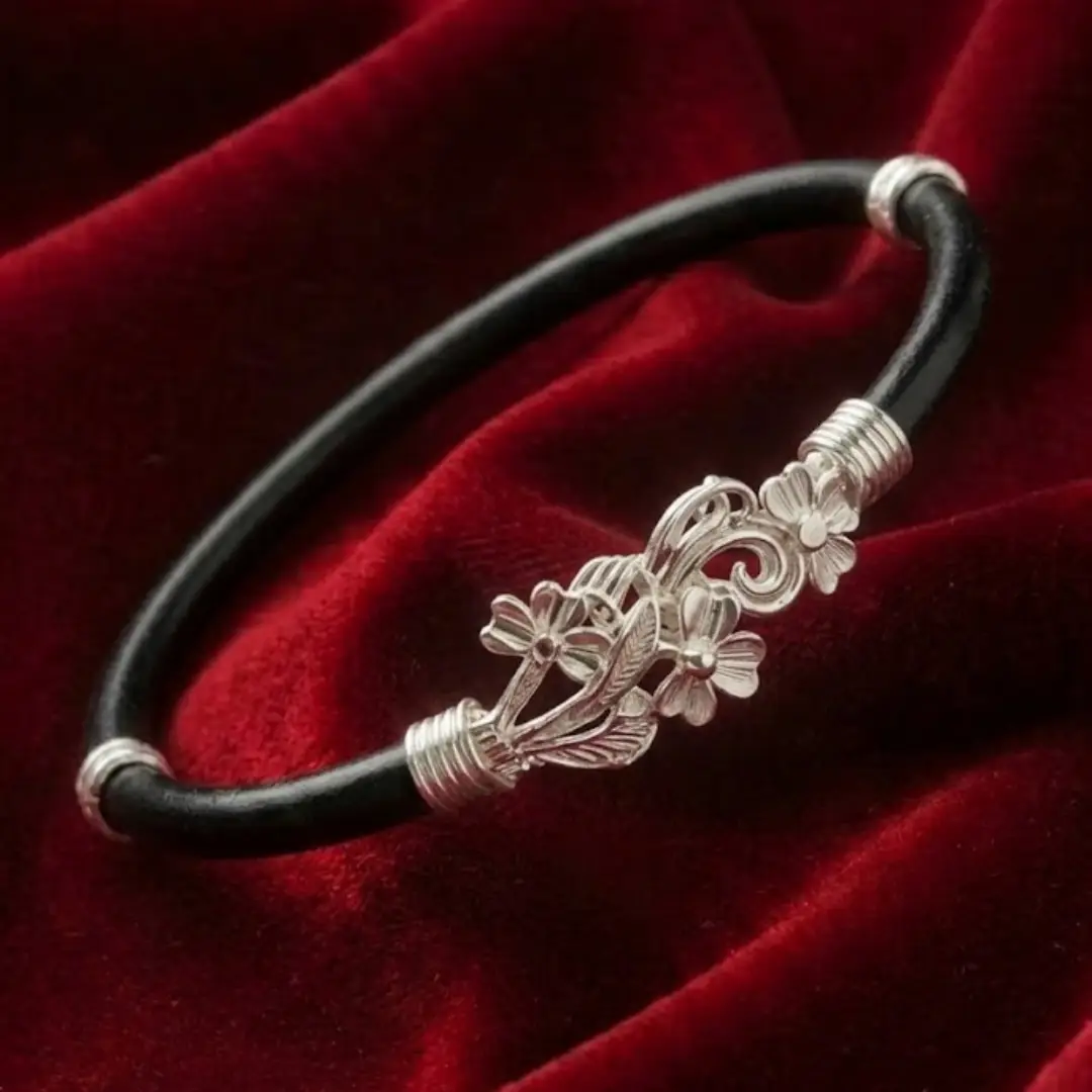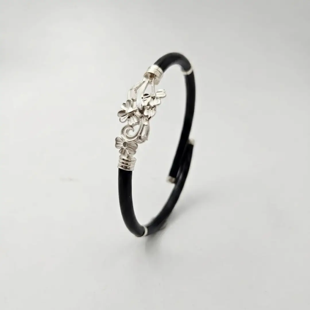 Experience the perfect blend of tradition and floral elegance with our 925 Silver Triple Flower Noya Bangle, exclusively from The Velvet Box. This stunning piece features three intricately crafted silver flowers blooming along a delicate vine, set against a classic and durable black base. Whether it’s for a traditional ceremony or a modern gathering, this bangle adds a sophisticated sparkle to your wrist.