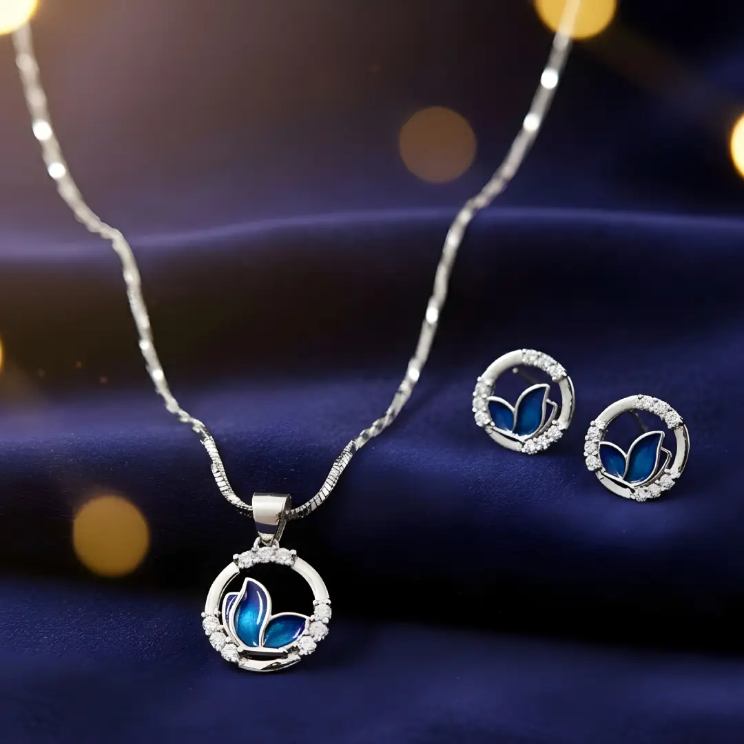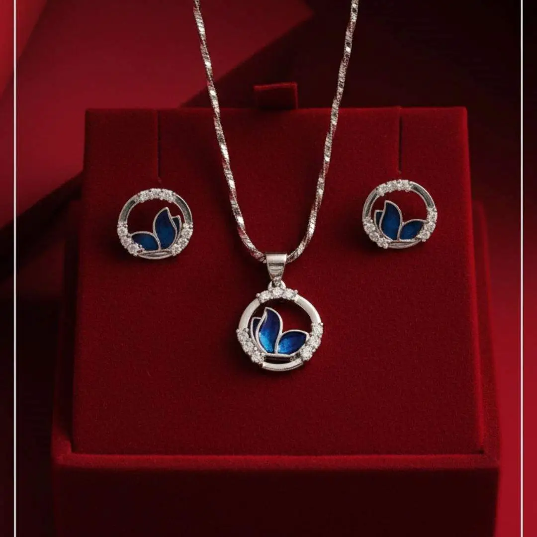 Enhance your everyday elegance with this charming 925 sterling silver butterfly jewellery set, featuring a graceful blue enamel butterfly enclosed in a sparkling circular frame. Accented with shimmering stones, the pendant and matching stud earrings together create a refined yet modern look.