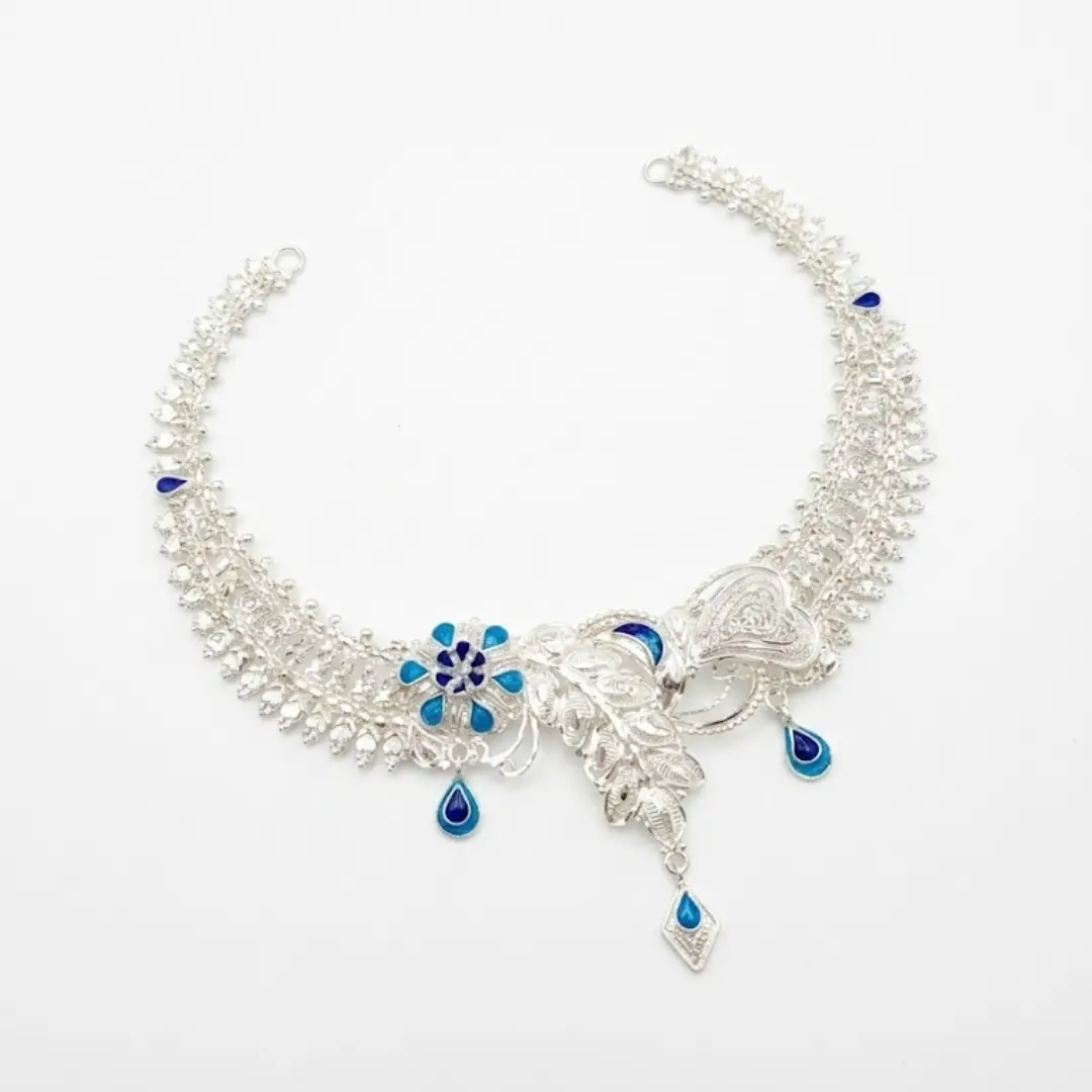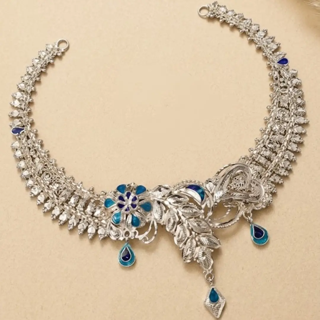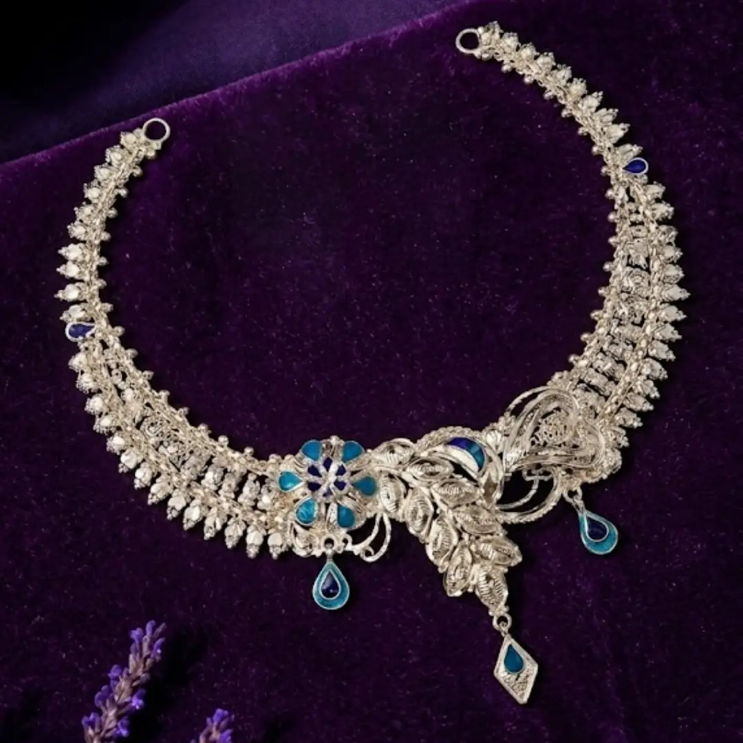 True leadership is defined by the choices you make. Choose to stand out with The Velvet Box. We present a masterpiece of silver artistry—an asymmetrical Leaf and Floral Choker designed for those who don’t just follow trends but set them. Handcrafted in Fine 925 Silver, this necklace is a bold proclamation of your exquisite taste.