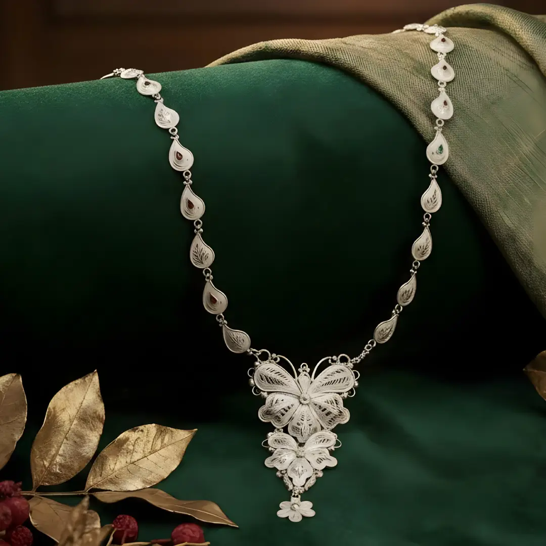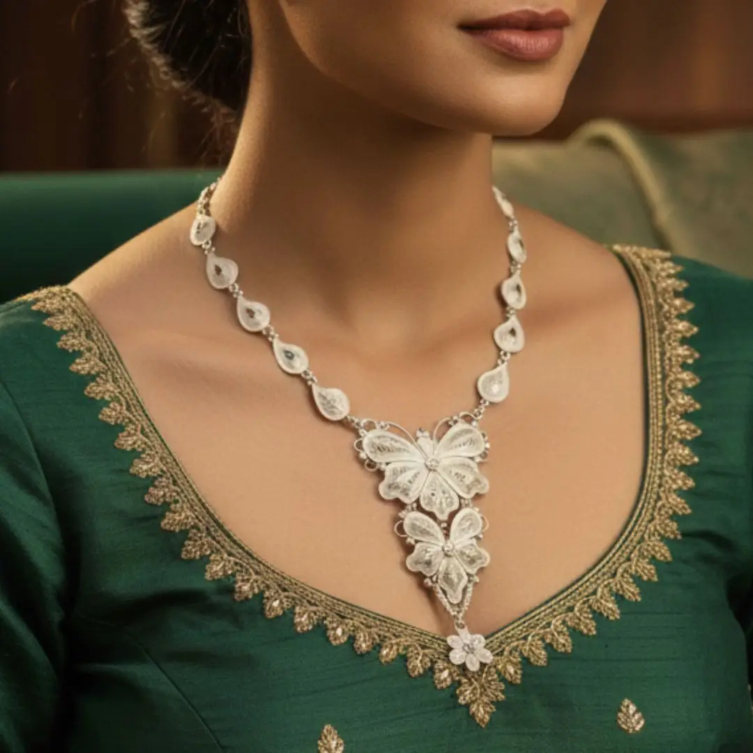 At the centre lies a stunning butterfly-shaped filigree pendant, crafted with intricate silver wirework that reflects traditional artistry blended with a modern silhouette. The layered butterfly wings create depth and movement, while the small floral dangler at the base adds a subtle charm and heritage touch.