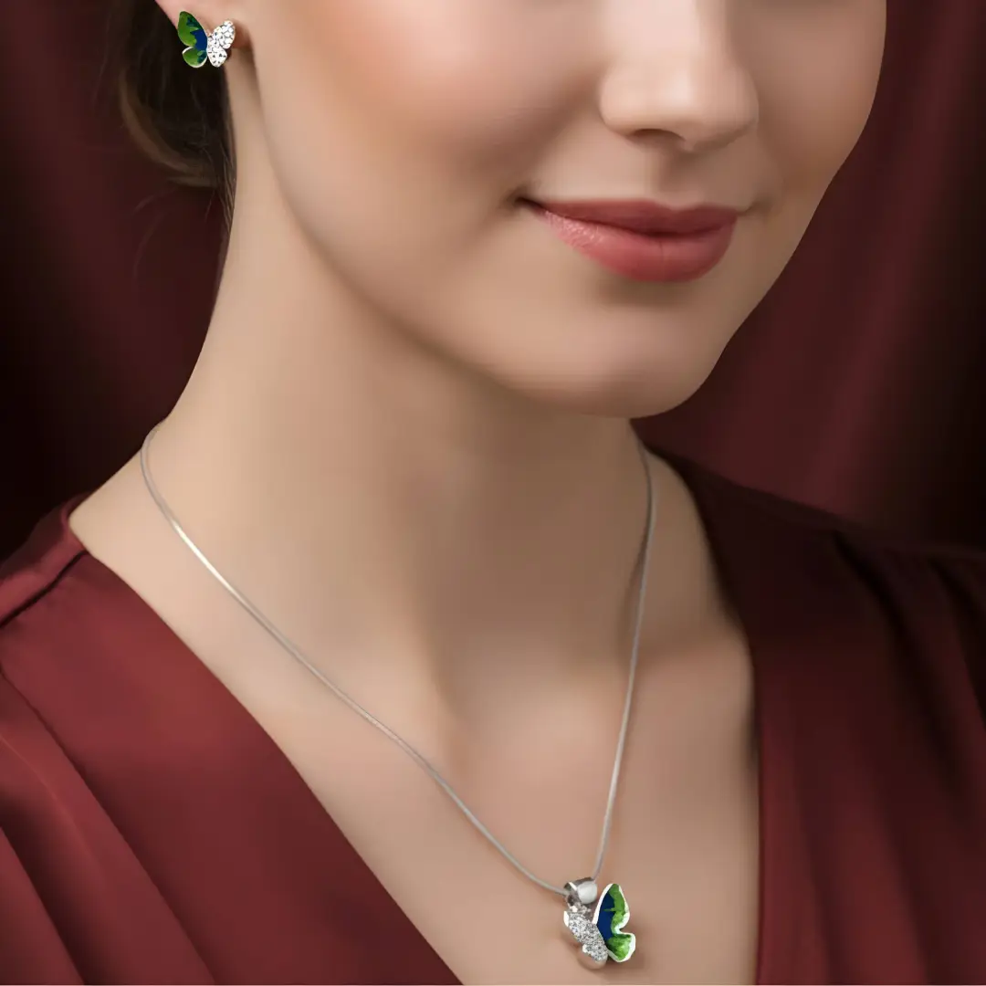 Bring charm, colour, and elegance to your everyday jewellery collection with this beautifully crafted 925 sterling silver butterfly pendant necklace set. The pendant showcases a graceful butterfly design with vibrant green & blue enamel detailing paired with sparkling stone accents that add a touch of brilliance.