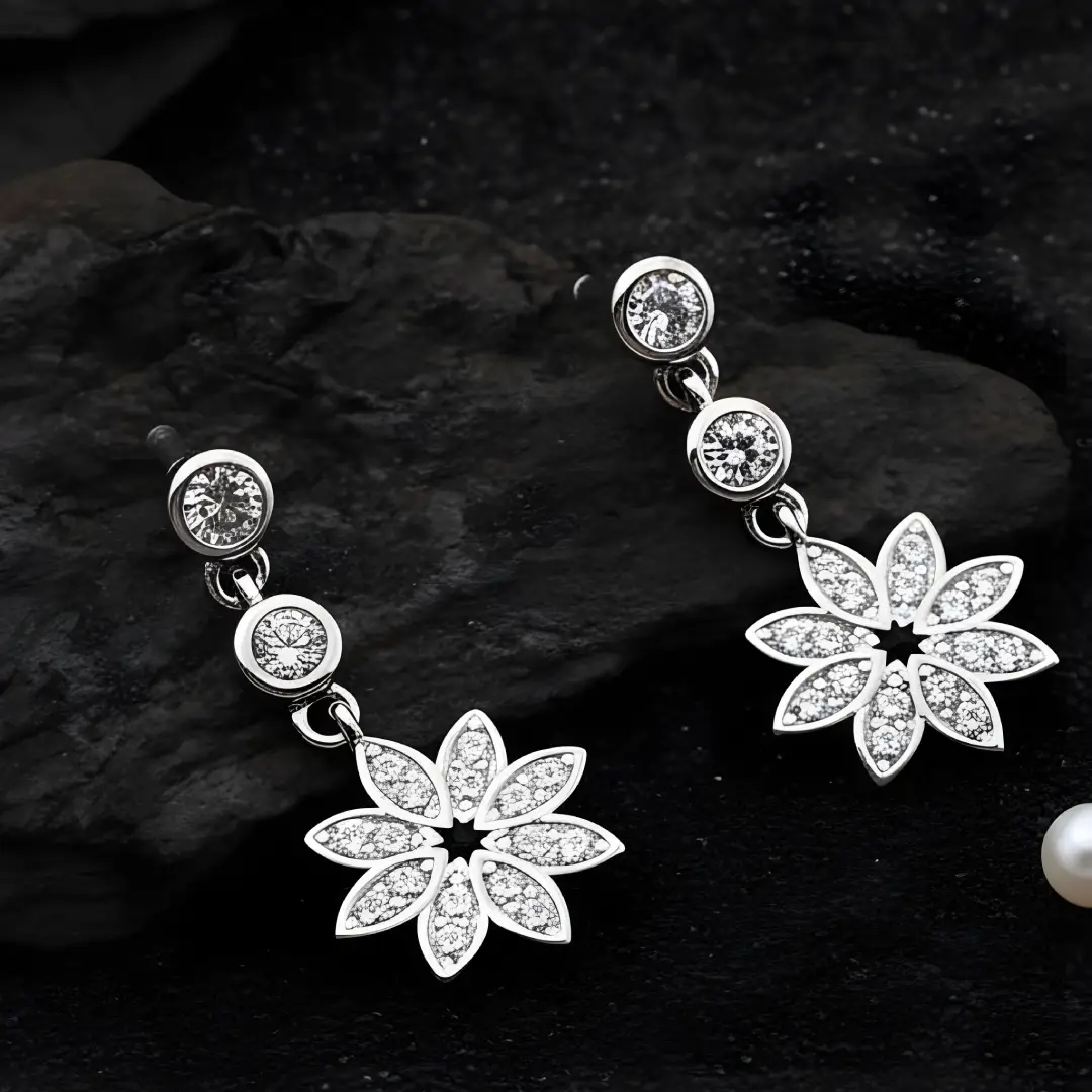 Bring timeless elegance to your jewellery collection with these exquisite 925 Sterling Silver Floral Drop Earrings. Designed with a graceful double round CZ stud top and finished with a sparkling flower-shaped dangle, these earrings offer a perfect blend of classic beauty and modern sophistication.