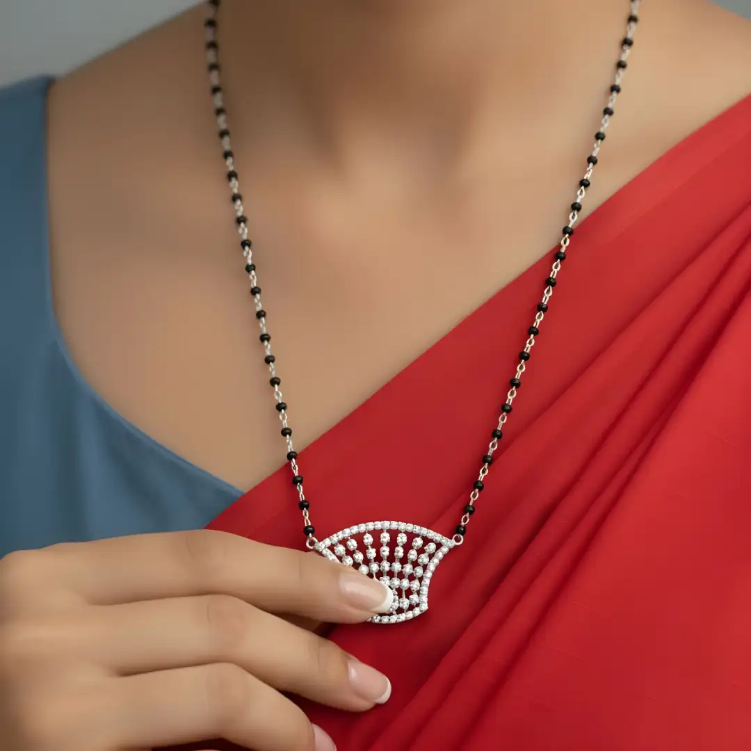This elegant 925 Sterling Silver Mangalsutra showcases a unique fan-shaped designer pendant adorned with fine stone detailing, paired with a traditional black bead chain. The artistic openwork pattern adds a contemporary touch while preserving the cultural significance of a mangalsutra.