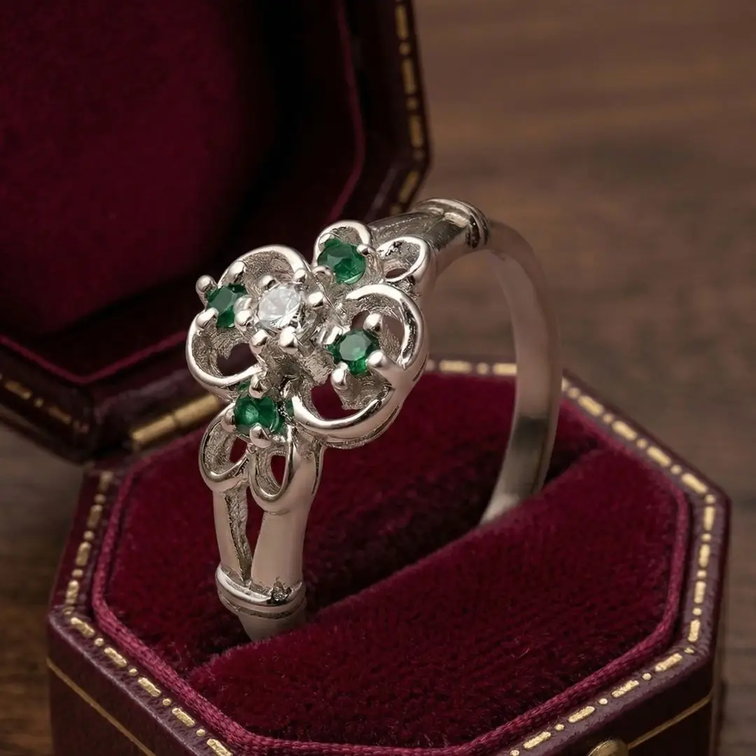 Adorn your hand with the timeless beauty of our 925 Sterling Silver Floral Clover Ring. Designed specifically for women and girls who appreciate delicate artistry, this ring features a stunning four-leaf clover motif. Each petal is set with vibrant, emerald-green stones that surround a brilliant central clear crystal, creating a sparkling focal point that captures the light from every angle.