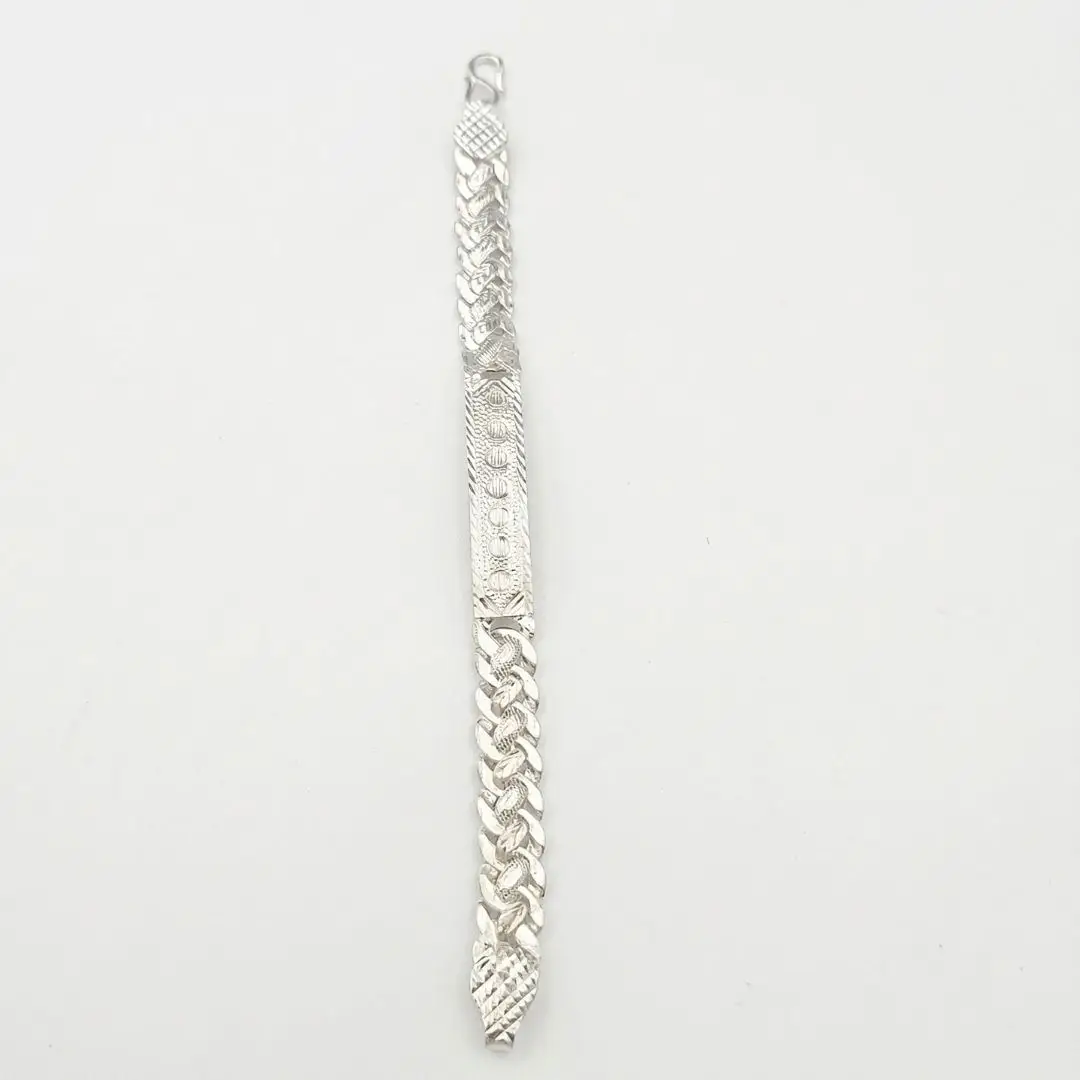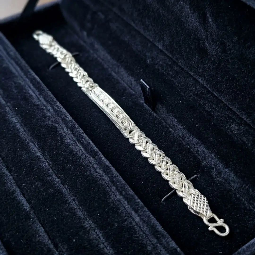 Make a sophisticated statement with our 925 Silver Designer Kada. This exquisite piece features a high-polish center plate adorned with an intricate floral engraving, perfectly complemented by a robust, textured braided link chain. Ideal for both festive occasions and daily luxury, this bracelet is a must-have for every woman and girl’s jewelry collection.