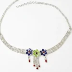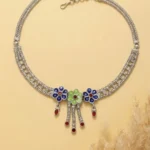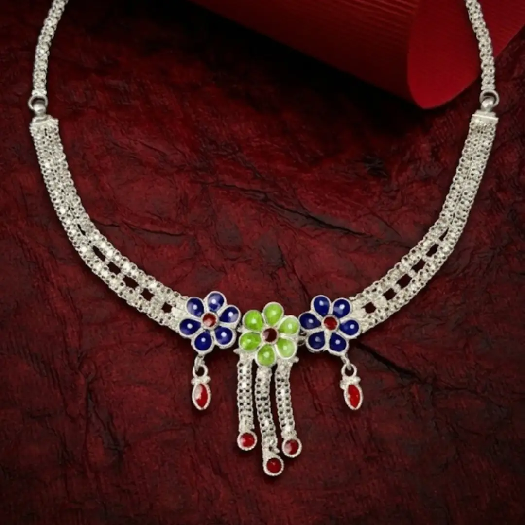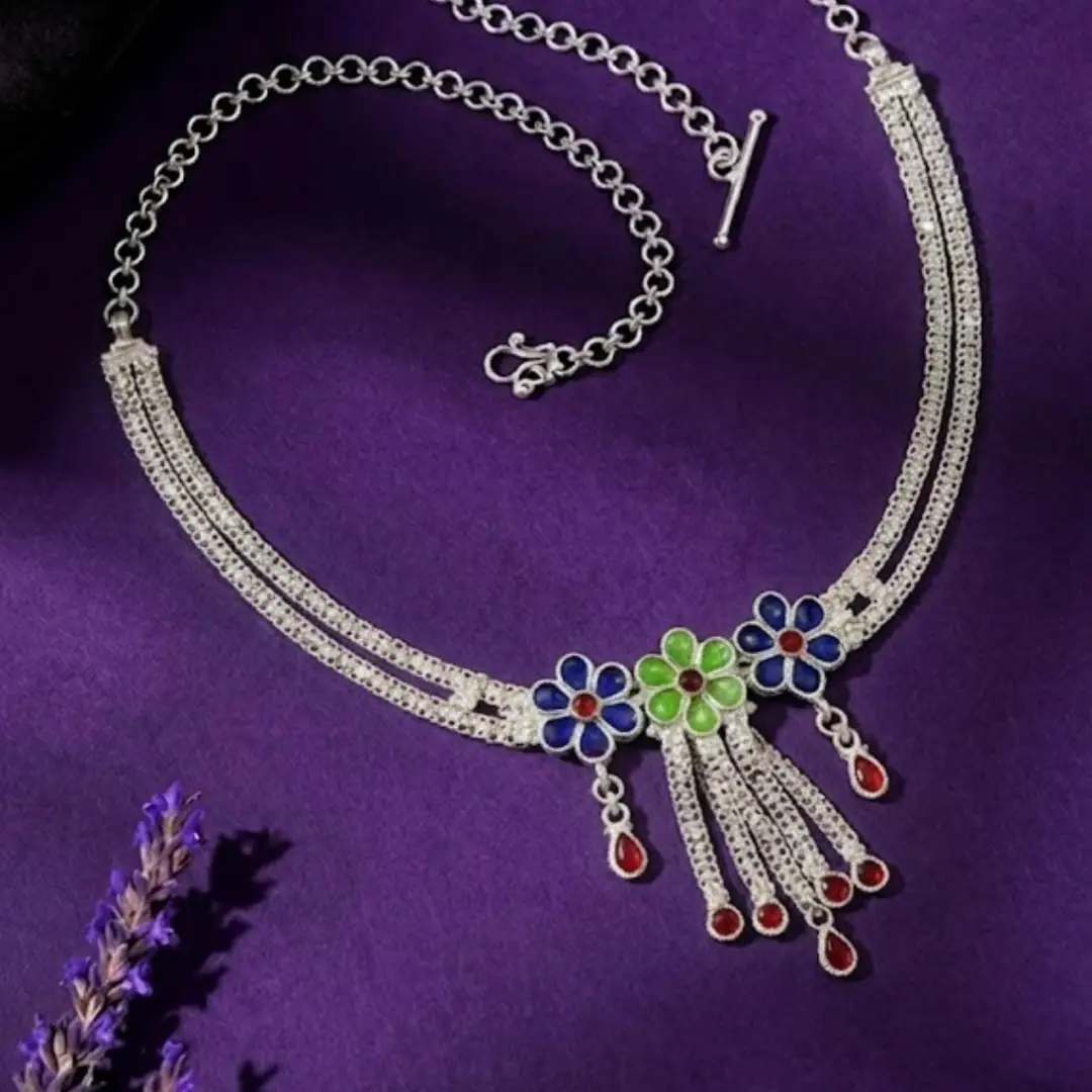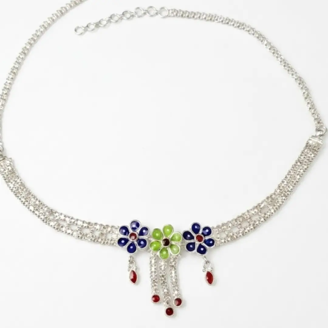 Elevate your jewelry collection with this stunning 925 Sterling Silver Floral Meenakari Necklace, specially designed for the modern woman who appreciates traditional craftsmanship. This necklace features three intricately crafted floral motifs adorned with vibrant blue and green enamel (Meenakari) work, highlighted by elegant red accents for a captivating focal point.