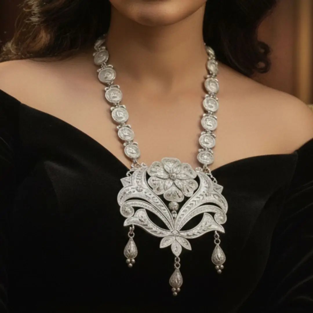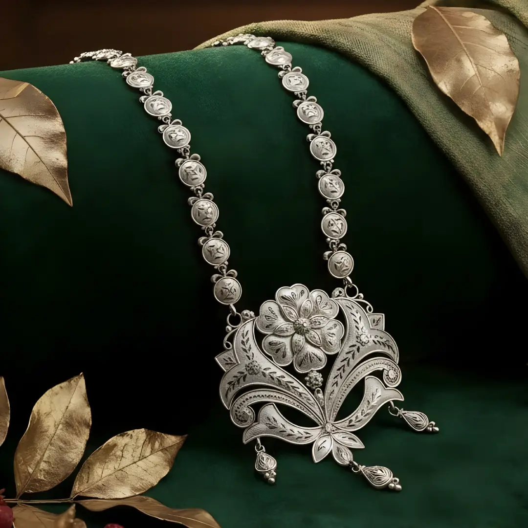 Elevate your ethnic elegance with this exquisitely handcrafted 925 sterling silver long necklace, designed in a timeless heritage floral motif. The necklace features a refined coin-style silver link chain, each disc delicately engraved to add character and traditional charm.