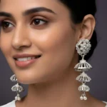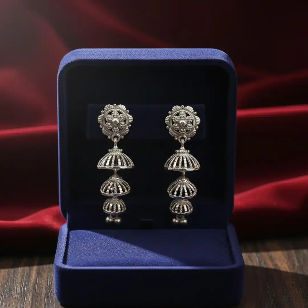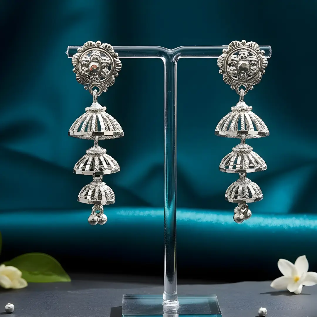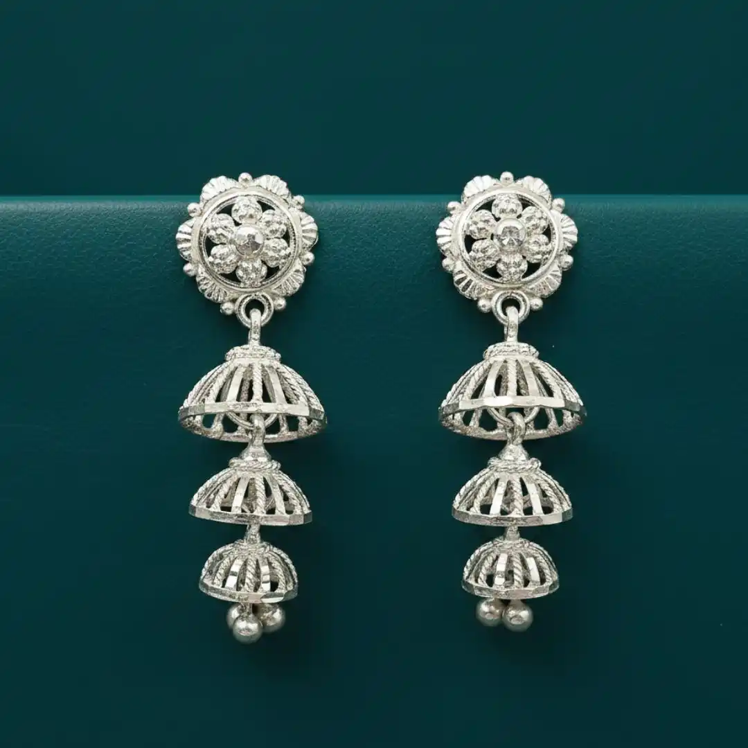 Elevate your ethnic elegance with these stunning 925 sterling silver jhumka earrings. Designed with a beautifully crafted floral stud adorned with delicate detailing, these earrings flow into a graceful triple-layered jhumka structure. The openwork dome design adds depth and movement, while the silver bead danglers enhance their traditional charm. Perfect for weddings, festivals, and special occasions, these earrings blend classic Indian artistry with timeless sophistication.