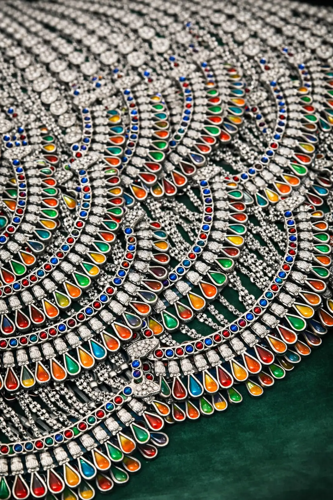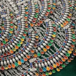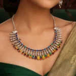 Each element is finely detailed to reflect traditional craftsmanship with a contemporary finish. The adjustable silver chain ensures a comfortable fit, making it perfect to pair with ethnic sarees, lehengas, kurtis, or fusion outfits. Whether for festive occasions, weddings, or statement everyday wear, this necklace brings timeless elegance and vibrant beauty.