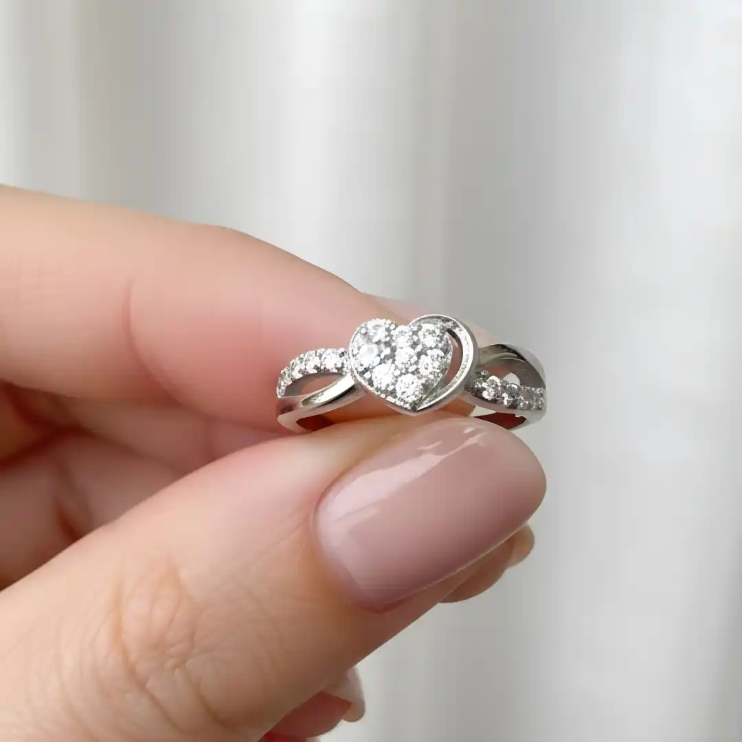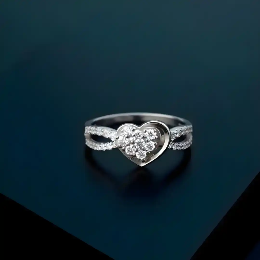 Celebrate love and elegance with this beautifully crafted 925 sterling silver heart ring. The ring features a charming heart-shaped centerpiece encrusted with sparkling cubic zirconia stones, while additional stones on the band add extra brilliance and sophistication.